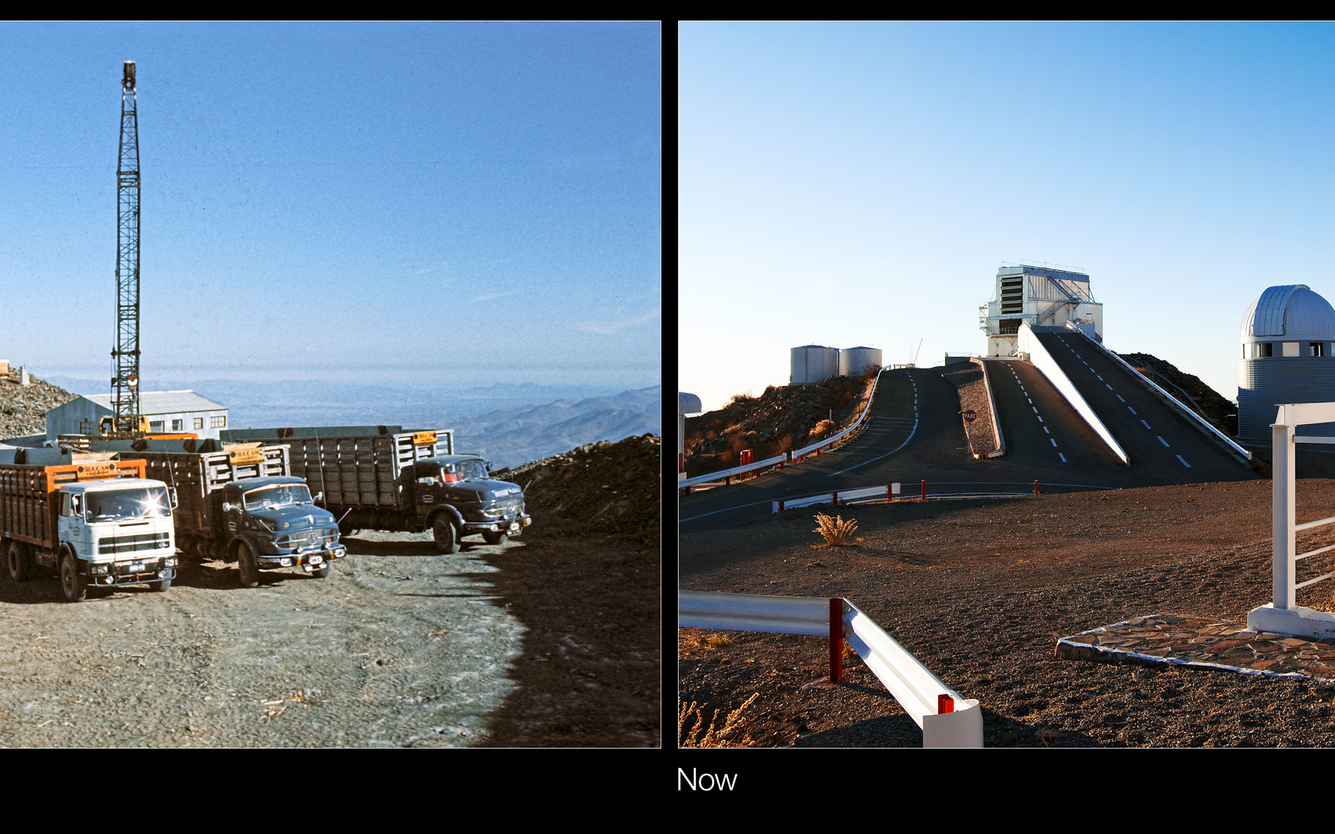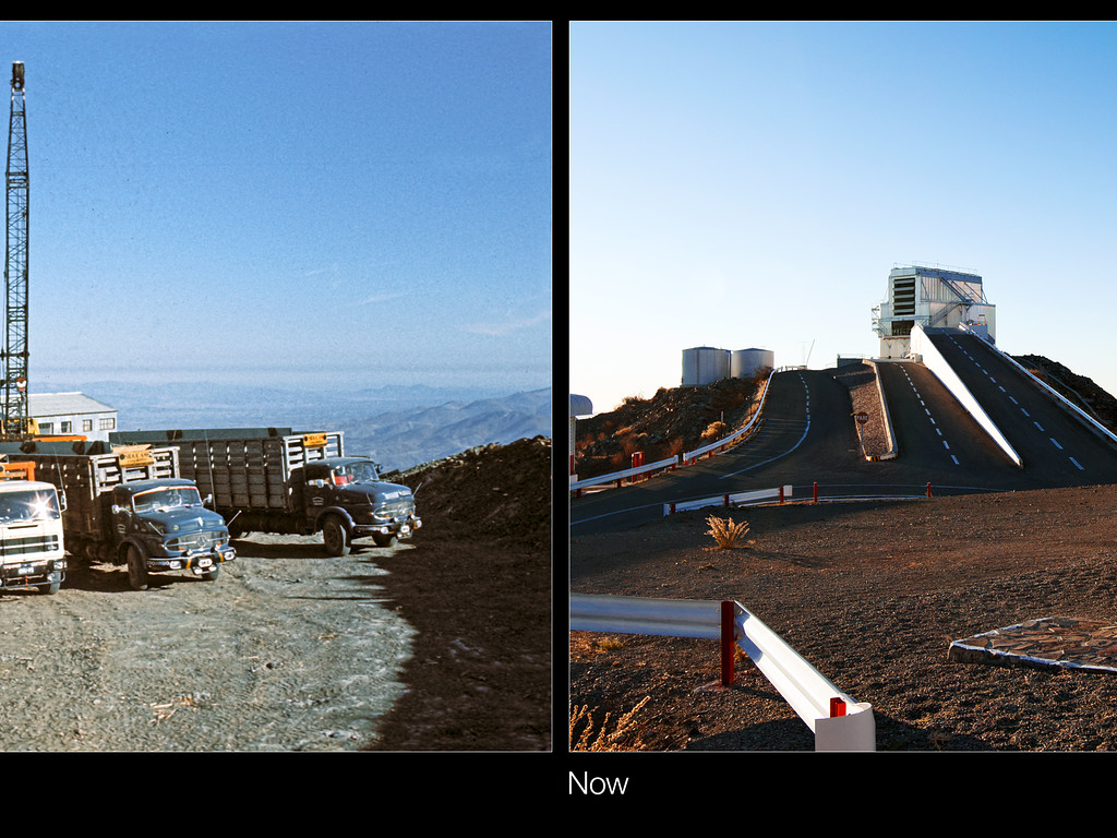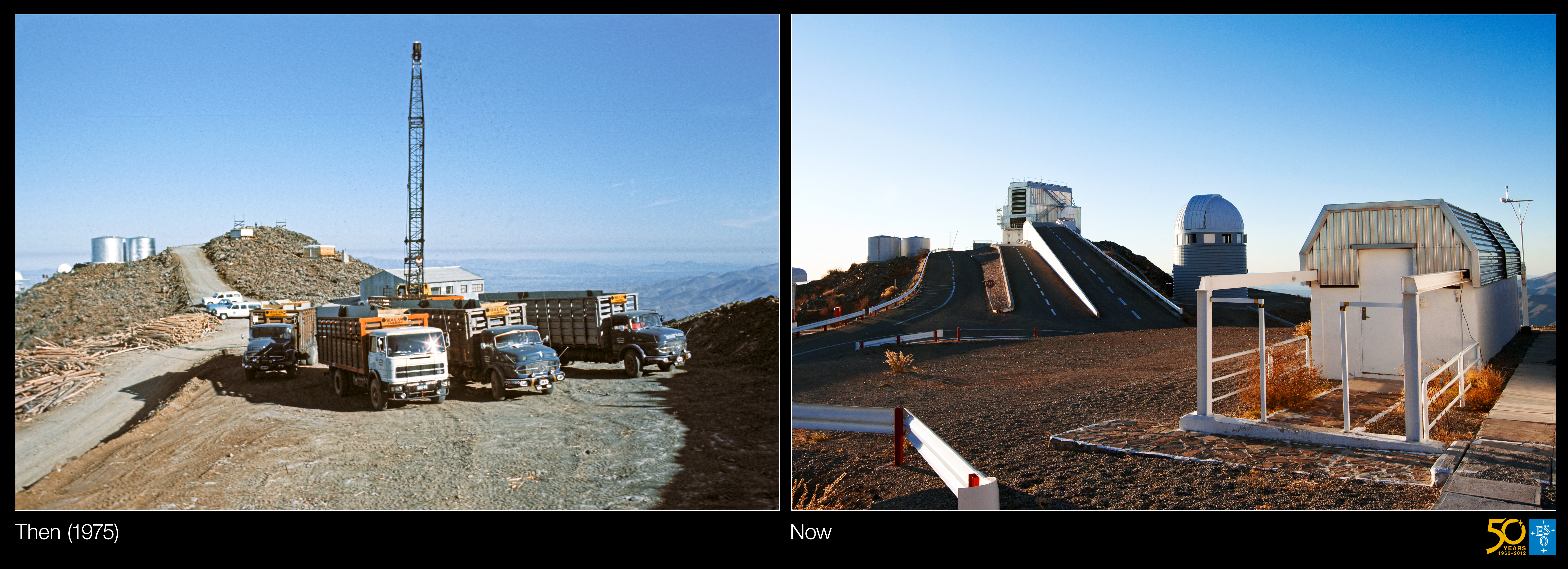 Dies ist eine Vergleichsaufnahme der historischen und der aktuellen Aufnahme des „Damals und Heute“-Bilds der Woche "Drei völlig verschiedene Teleskope auf La Silla".