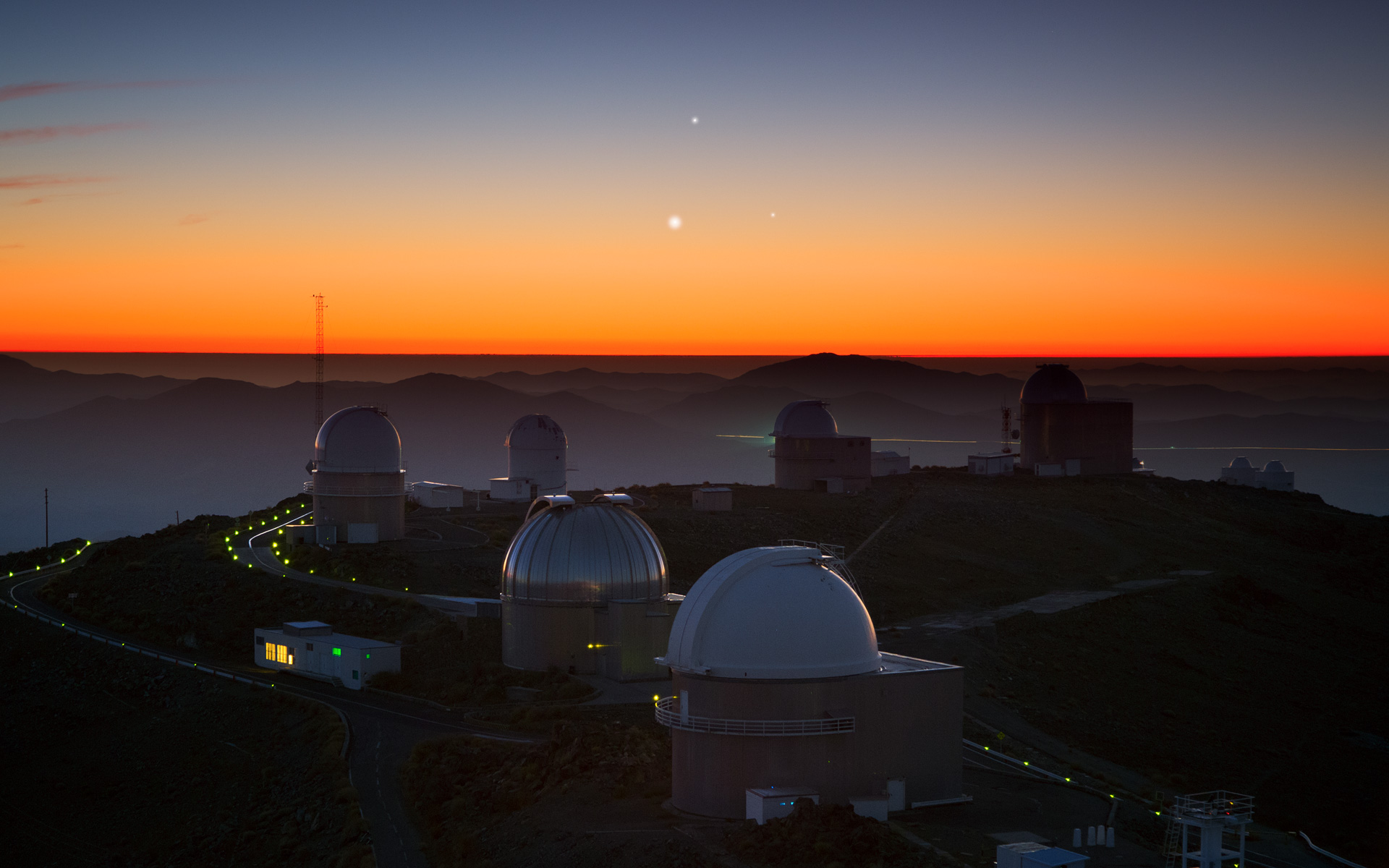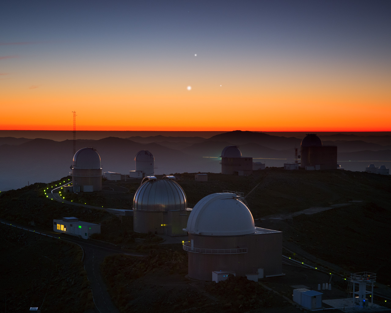 Eine solche Gelegenheit hatte ESO-Fotobotschafter Yuri Beletsky, der am Sonntag, dem 26. Mai im Norden Chiles die Chance hatte, dieses eindrucksvolle Bild vom La Silla Observatorium der ESO aus aufzunehmen. Um die Kuppeln der Teleskope herum gruppieren sich die drei Planeten – Jupiter (oben), Venus (links) und Merkur (recht unten) – und vollführen ihren kosmischen Tanz.