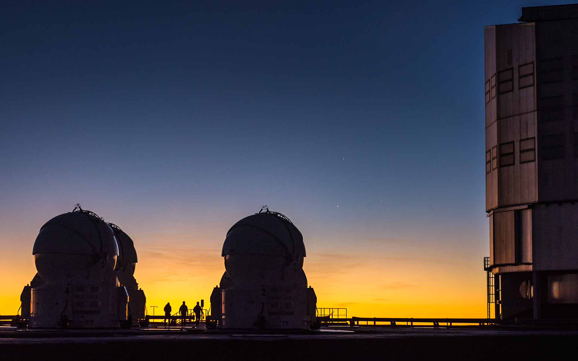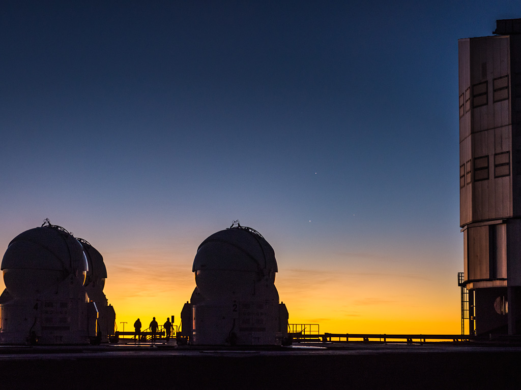 ESO-Fotobotschafter Gabriel Brammer konnte am 26. Mai 2013 diesen perfekten Moment mit dem Leitmotiv der Zahl drei einfangen: Drei ESO-Mitarbeiter stehen auf der Beobachtungsplattform des Very Large Telescope zwischen dreien der VLT-Hilfsteleskope. Über ihnen stehen drei Planeten in Konjunktion am Dämmerungshimmel: Jupiter (oben), Venus (links) und Merkur (recht unten).