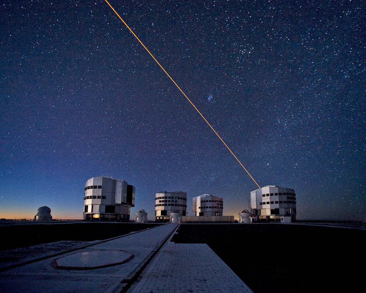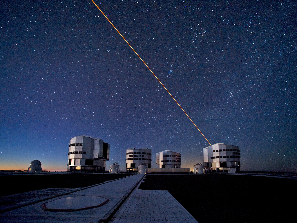 Das Very Large Telescope (VLT) der ESO während einer typischen Beobachtungsnacht. Das Bild, aufgenommen in der Dämmerung von der Beobachtungsplattform mit Blick Richtung Nord-Nordwesten, zeigt die vier 8,2-Meter-Hauptteleskope (Unit Telescopes oder kurz UTs). Von links nach rechts: Antu, Kueyen, Melipal und Yepun (die Namen der Teleskope in der Sprache der Mapuche). Vor den Hauptteleskopen befinden sich die vier 1,8-Meter-Hilfsteleskope (Auxiliary Telescopesoder kurz ATs), die ausschließlich zur Interferometrie eingesetzt werden - einer Technik, die er erlaubt, bis zu 25 mal feinere Details aufzulösen als mit den Einzelteleskopen. Die Anordnung der ATs kann dem jeweiligen Beobachtungsziel angepasst werden, indem die Teleskope auf der Plattform auf 30 verschiedene Positionen bewegt werden. Einer dieser Punkte, abgedeckt von einer sechseckigen Platte, ist im Vordergrund des Bildes sichtbar. Von UT4 (Yepun) geht ein rötlicher Laserstrahl aus, der in einer Höhe von 90 Kilometern in der Mesosphäre einen künstlichen Stern erzeugt. Dieser Laserleitstern (Laser Guide Star, abgekürzt LGS) ist Teil des Systems adaptiver Optik, das es den Astronomen ermöglicht, die Turbulenz der Erdatmosphäre zu kompensieren und so Bilder zu generieren, die so scharf sind wie wenn das Teleskop im Weltraum stünde. Die bläuliche Sterngruppe rechts des Laserstrahls sind die Plejaden.