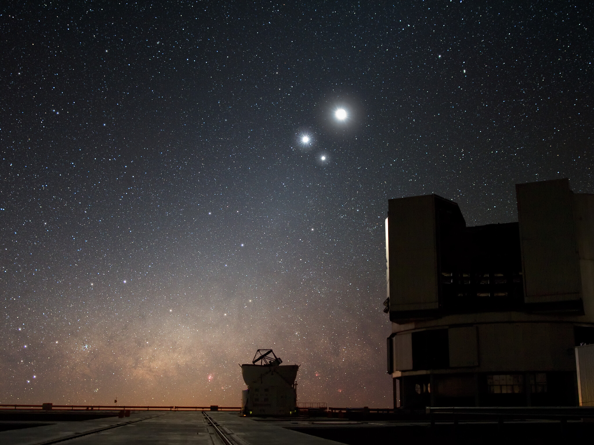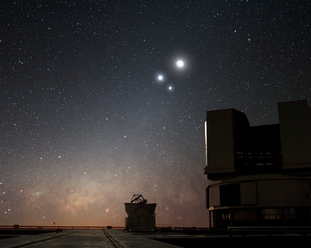Über dem Very Large Telescope (VLT) am Paranal-Observatorium der ESO scheint der Mond hell mit zwei Begleitern am Nachthimmel: Weiter oben und nahezu in der Bildmitte steht die Venus, der nächstgelegene Nachbarplanet unserer Erde. Rechts davon sieht man den weiter entfernten großen Gasriesen Jupiter. Solche scheinbaren nahen Begegnungen von Himmelskörpern - in Wirklichkeit sehen wir sie nur in derselben Richtung, obwohl sie Hunderte Millionen Kilometer voneinander entfernt sind - nennt man Konstellationen.
