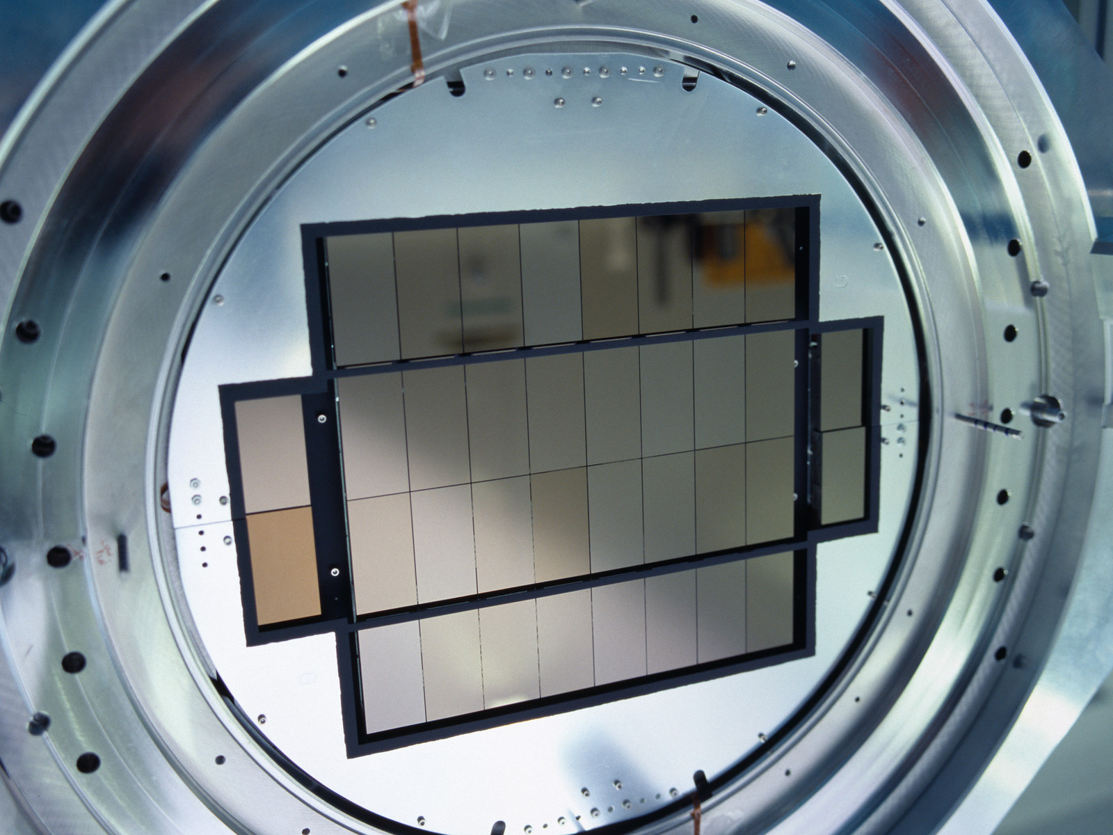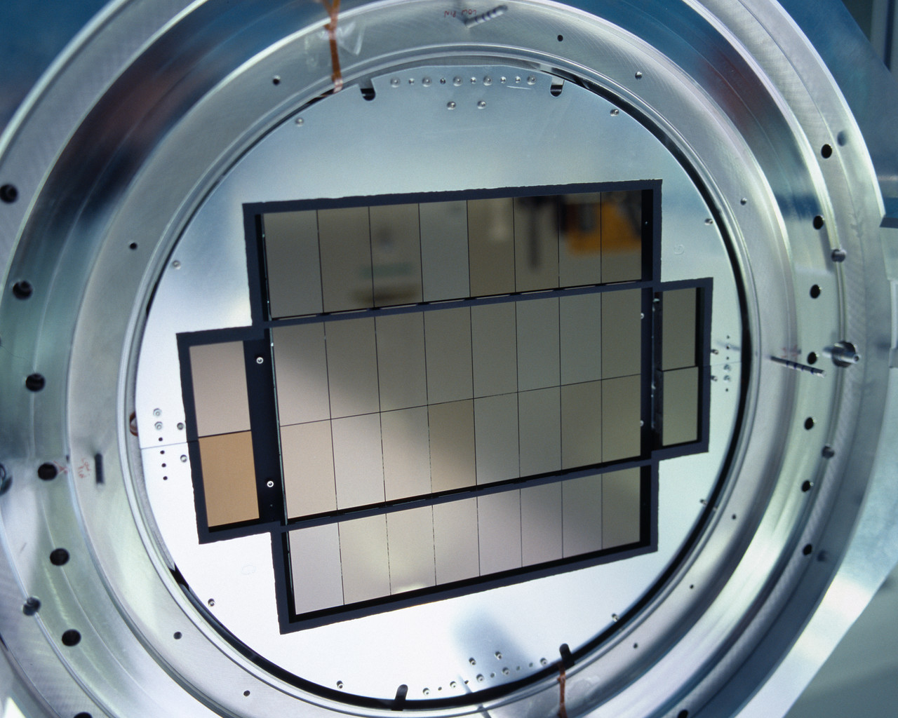 Image of the OmegaCAM under construction, the camera for the VLT Survey Telescope (VST) in the Chilean desert. The OmegaCAM will provide views of faint and rare objects for the Very Large Telescope to then examine, and work as a surveyor for trans-Neptunian objects, distant galaxy clusters, and other astronomical objects. It will be the successor of the present Wide Field Imager (WFI) at the 2.2-m MPG/ESO Telescope on La Silla.