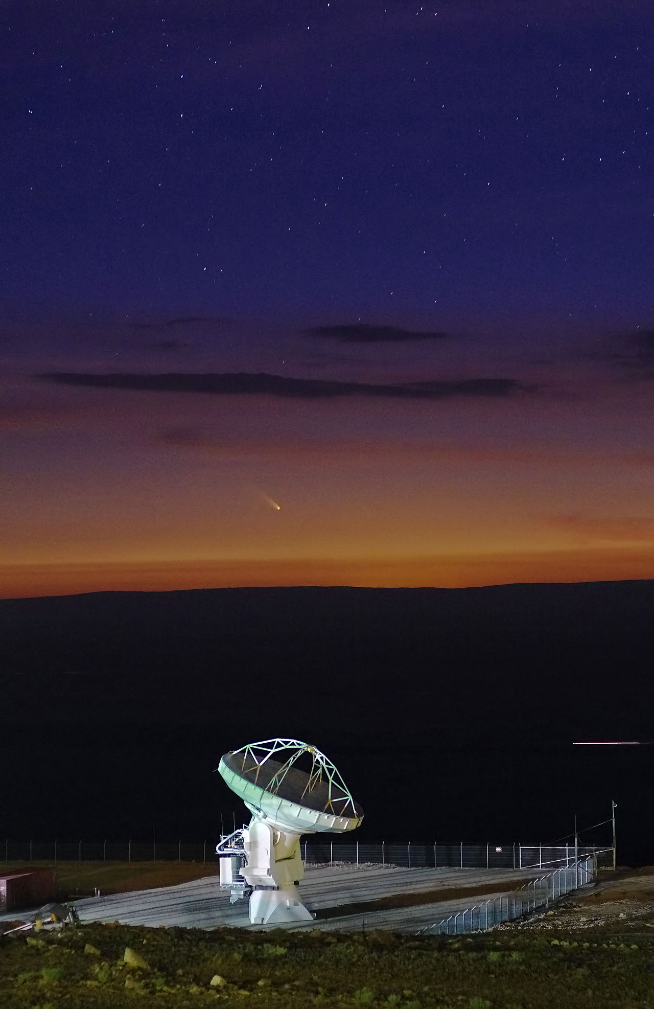 This large antennae, twelve metres in diameter, is not as lonely as it looks. It shares this spot on the Chajnantor plateau with 65 neighbors and between them they make up the Atacama Large Millimeter/submillimeter Array (ALMA). The site of this huge array in the Chilean Andes is at an altitude of 5000 metres.