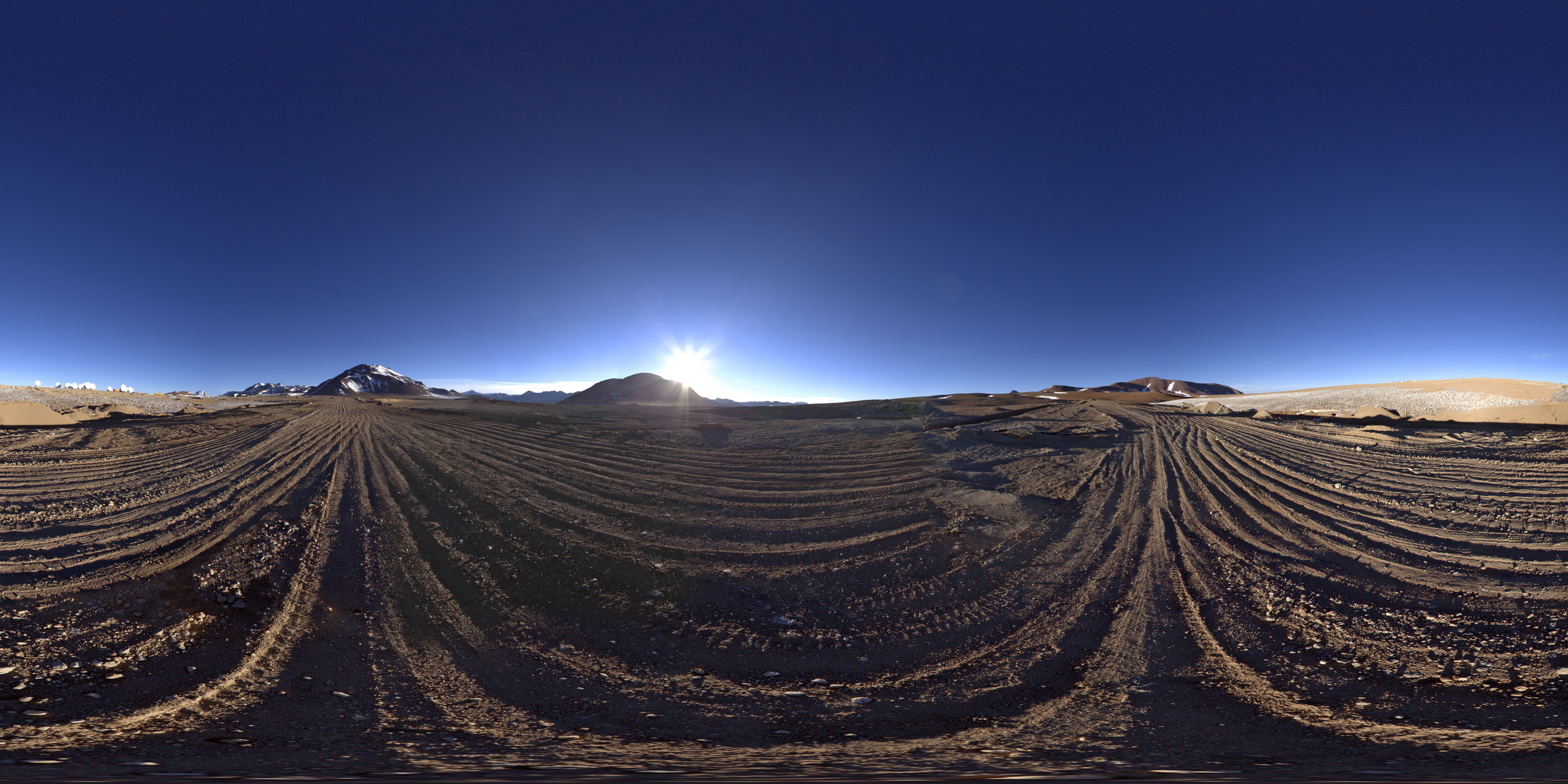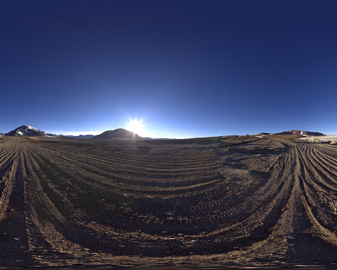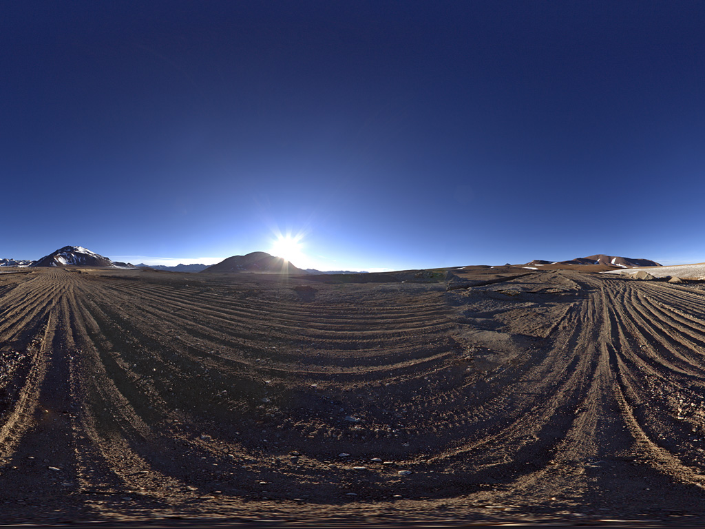 This panoramic image shows the Chajnantor Plateau, located at an altitude of 5000 meters in the Chilean Andes. The collection of 12 antennas visible on the far left, each with a diameter of 7 metres, make up the ALMA Compact Array (ACA).
