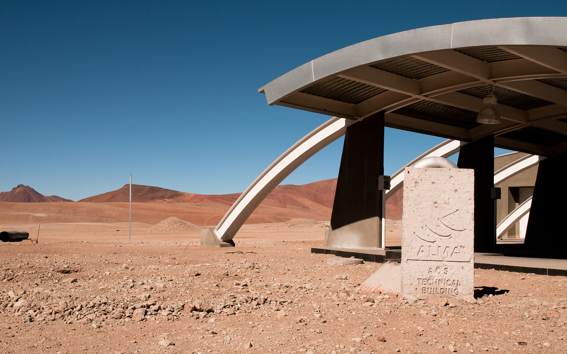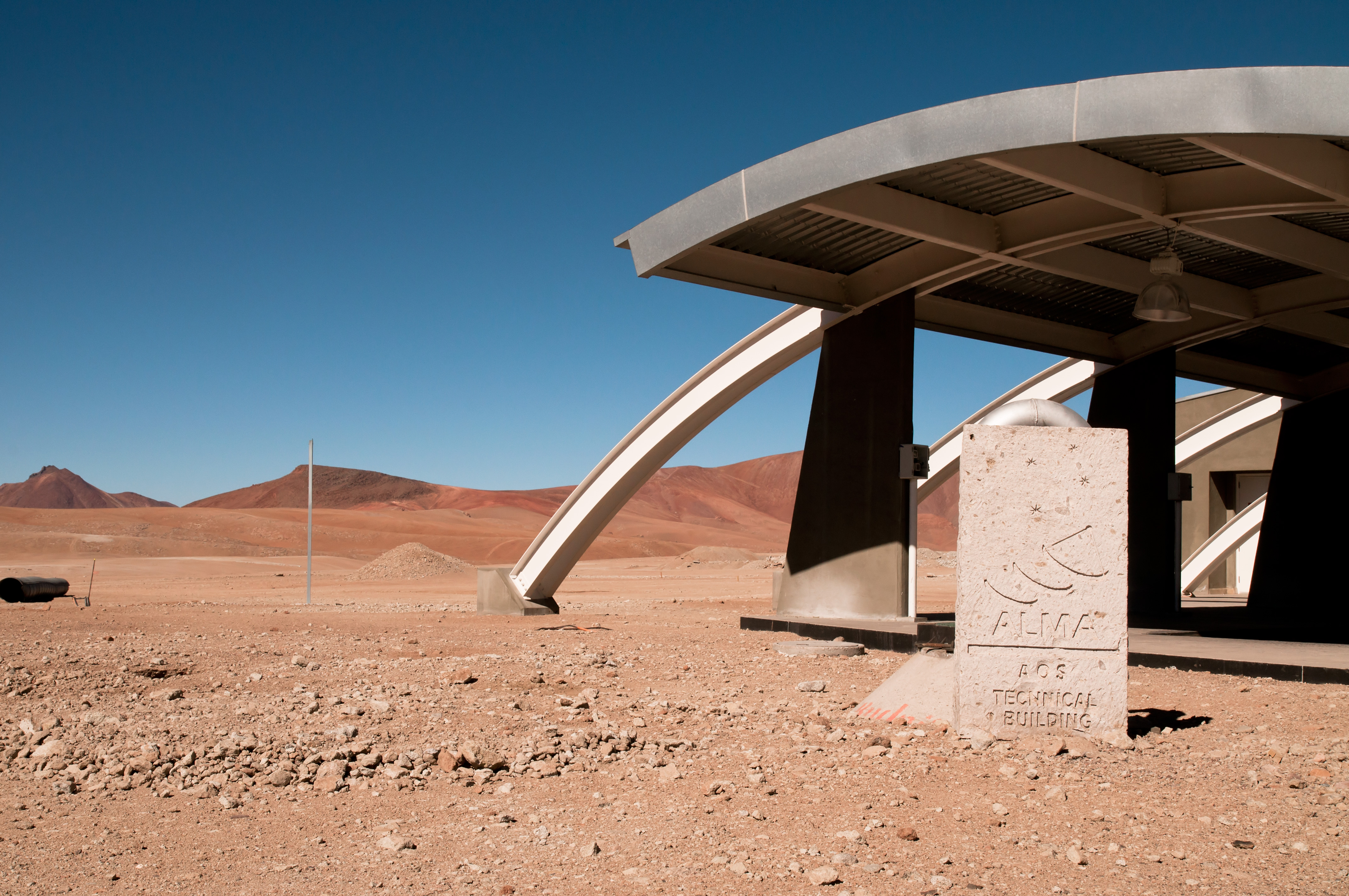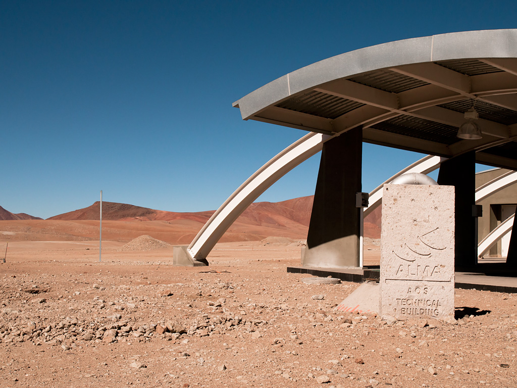 The entrance of the ALMA Array Operations Site (AOS) technical building, located at an altitude of 5000 metres above sea level, on the Chajnantor plateau, in the Chilean Andes. This building hosts the ALMA Correlator, a powerful computer which will combine the signals from the ALMA antennas, making them work together as the most powerful submillimetre-wavelength radio telescope in the world. The observations are controlled from the ALMA Operations Support Facility (OSF), located at the much more comfortable altitude of 2900 metres, on the road to Chajnantor.