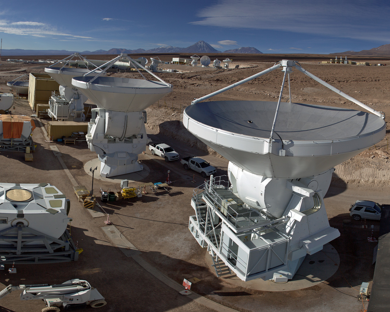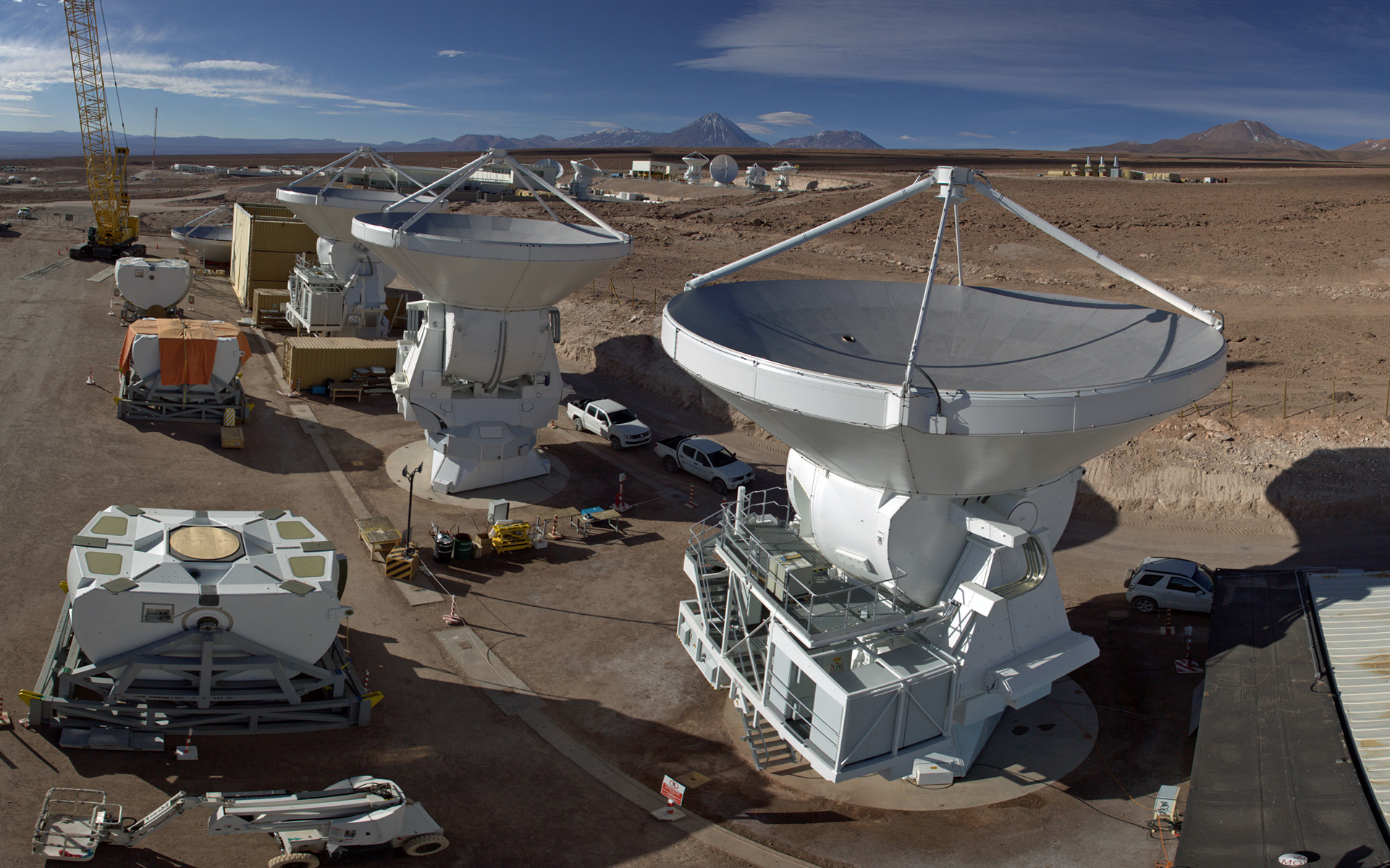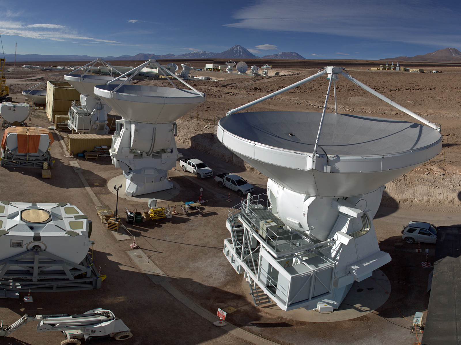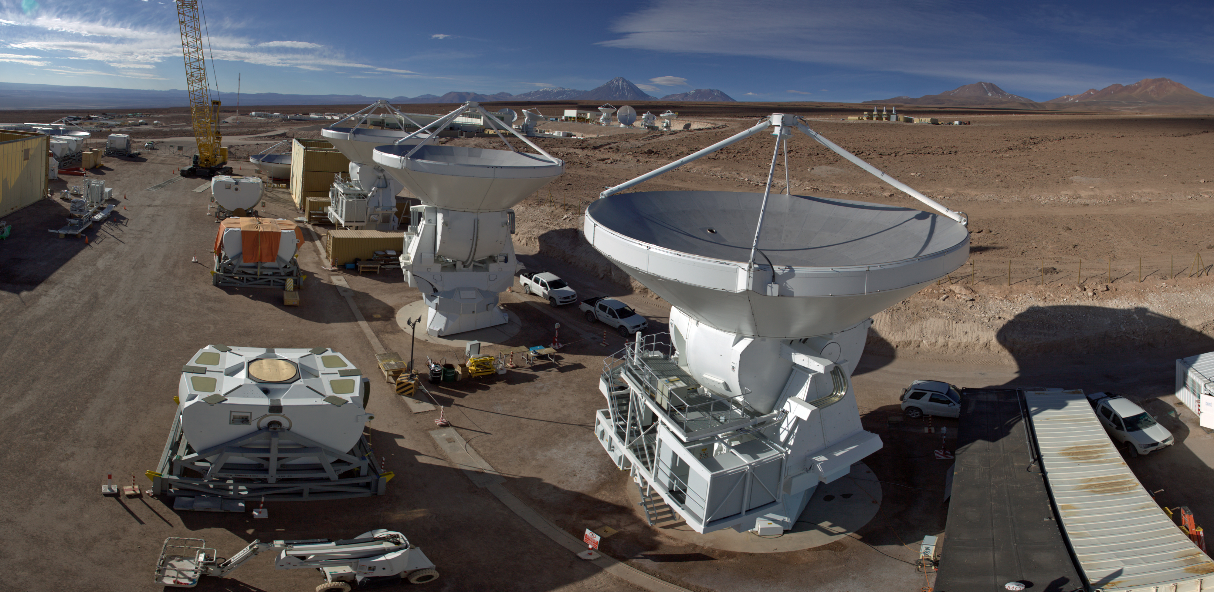 This panoramic view shows the AEM Consortium’s facility where the European antennas for the Atacama Large Millimeter/submillimeter Array (ALMA) are assembled and tested. Some of the 25 European antennas can be seen, with each antenna having a dish 12 metres in diameter, and a weight of about 95 tonnes.