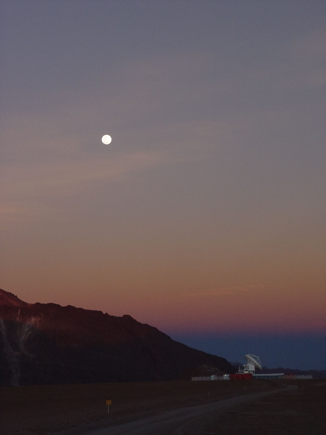 The moon high above the Atacama Pathfinder Experiment (APEX) at sunset. The antenna is visible in the bottom-right of the image.