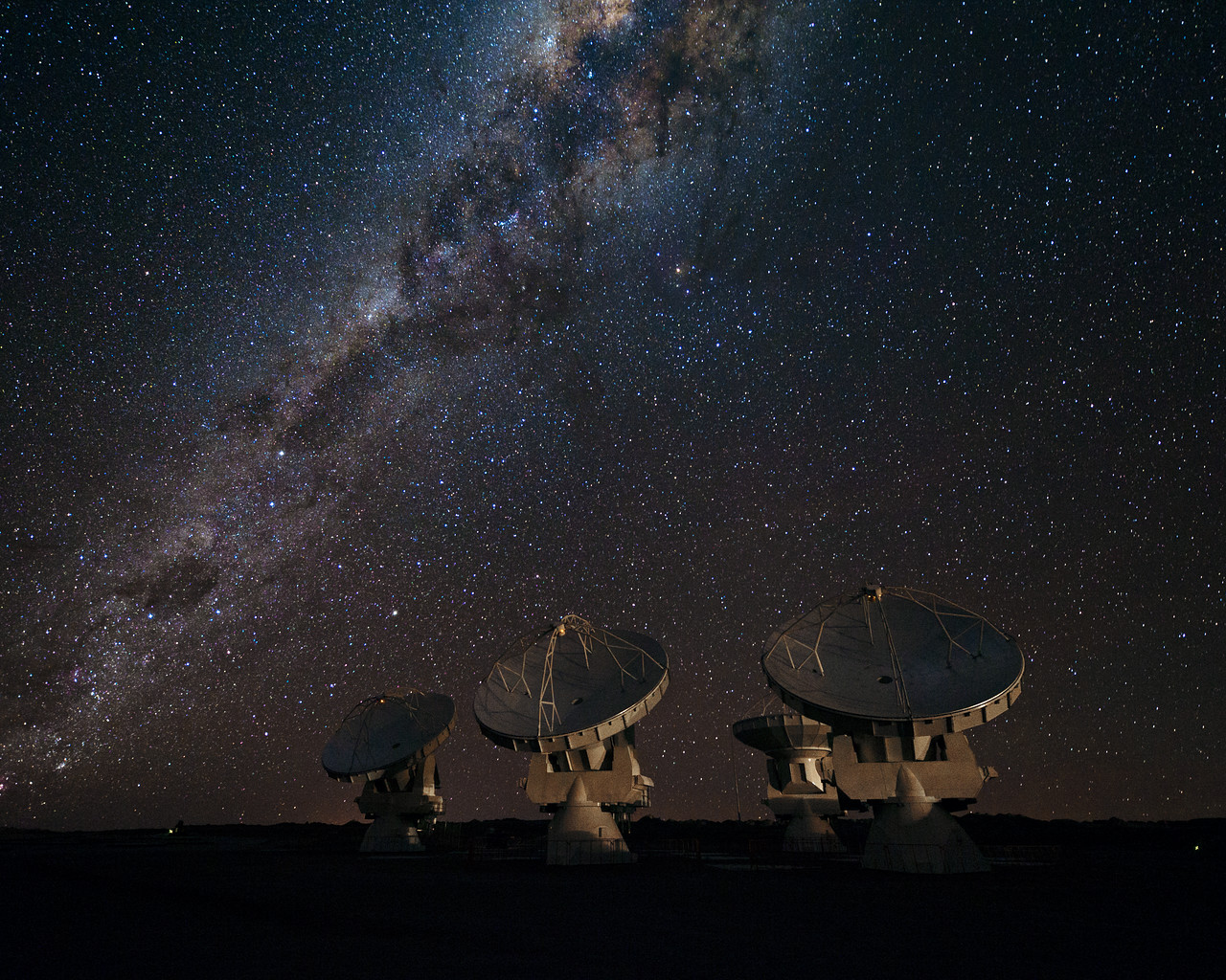 Four of the first ALMA antennas at the Array Operations Site (AOS), located at 5000 metres altitude on the Chajnantor plateau, in the II Region of Chile. Three of them — those which are pointing in the same direction — are being tested together as part of the ongoing Commissioning and Science Verification process. Across the image in the background is the impressive plane of the Milky Way, our own galaxy, seen in the sky edge-on. The centre of our galaxy is partially visible as a yellowish bulge crossed by dark lanes, at the upper edge of the image. The dark lanes are huge clouds of interstellar dust that lie in the disc of the galaxy. While opaque in visible light, they are transparent at longer wavelengths, such as the millimetre and submillimetre radiation detected by ALMA. ALMA, the Atacama Large Millimeter/submillimeter Array, is the largest astronomical project in existence and is a truly global partnership between the scientific communities of East Asia, Europe and North America with Chile. ESO is the European partner in ALMA.