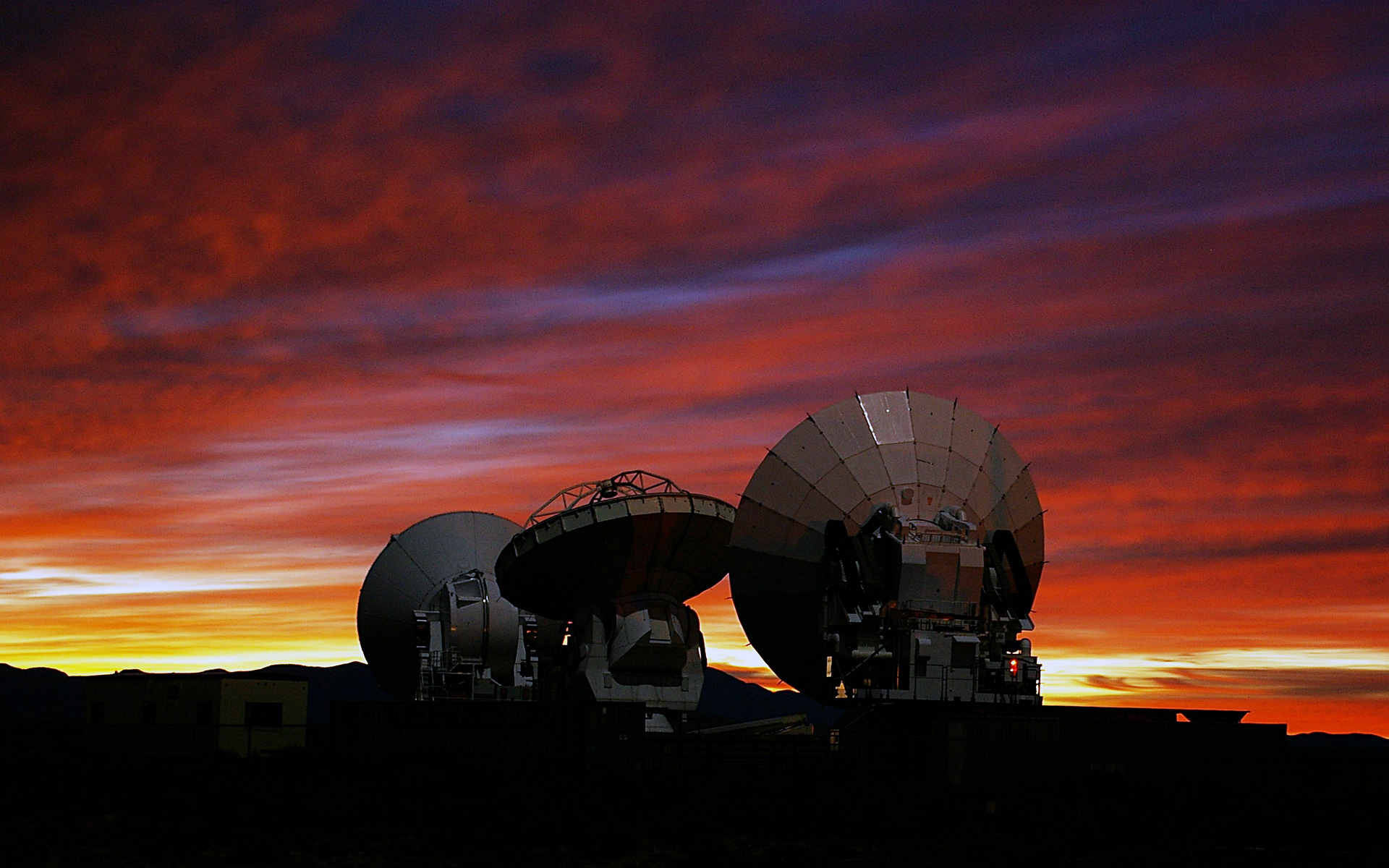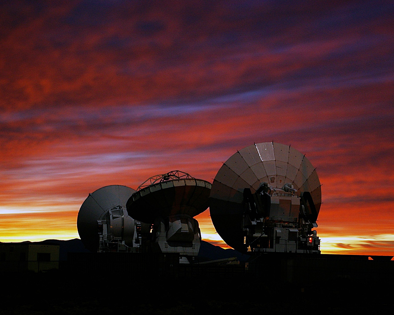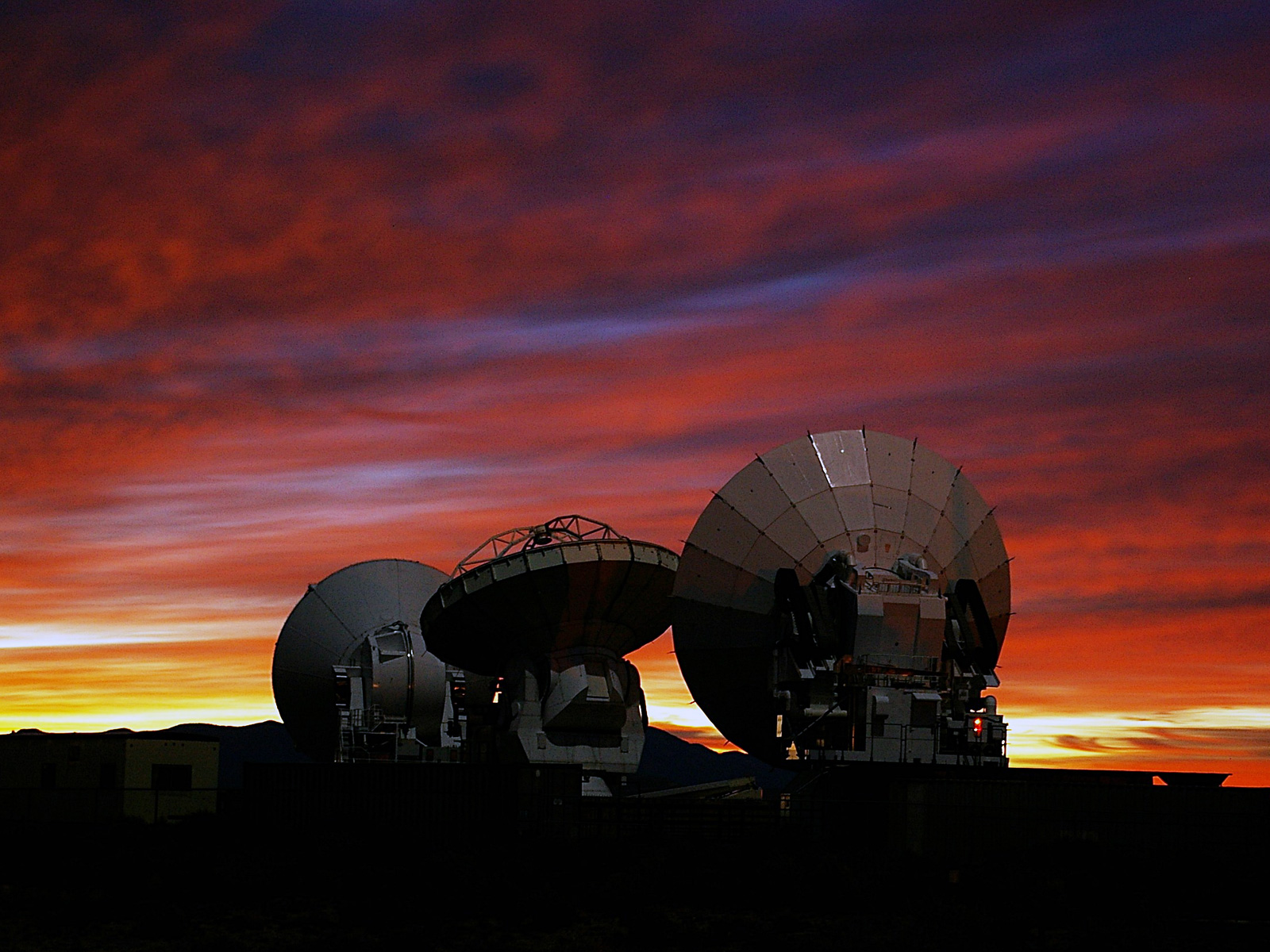 A spectacular sunset view of the three prototypes of ALMA antennas, developed by Japan, North America and Europe, respectively, at the ALMA Test Facility (ATF) in Socorro, New Mexico, USA, where they have been evaluated.
