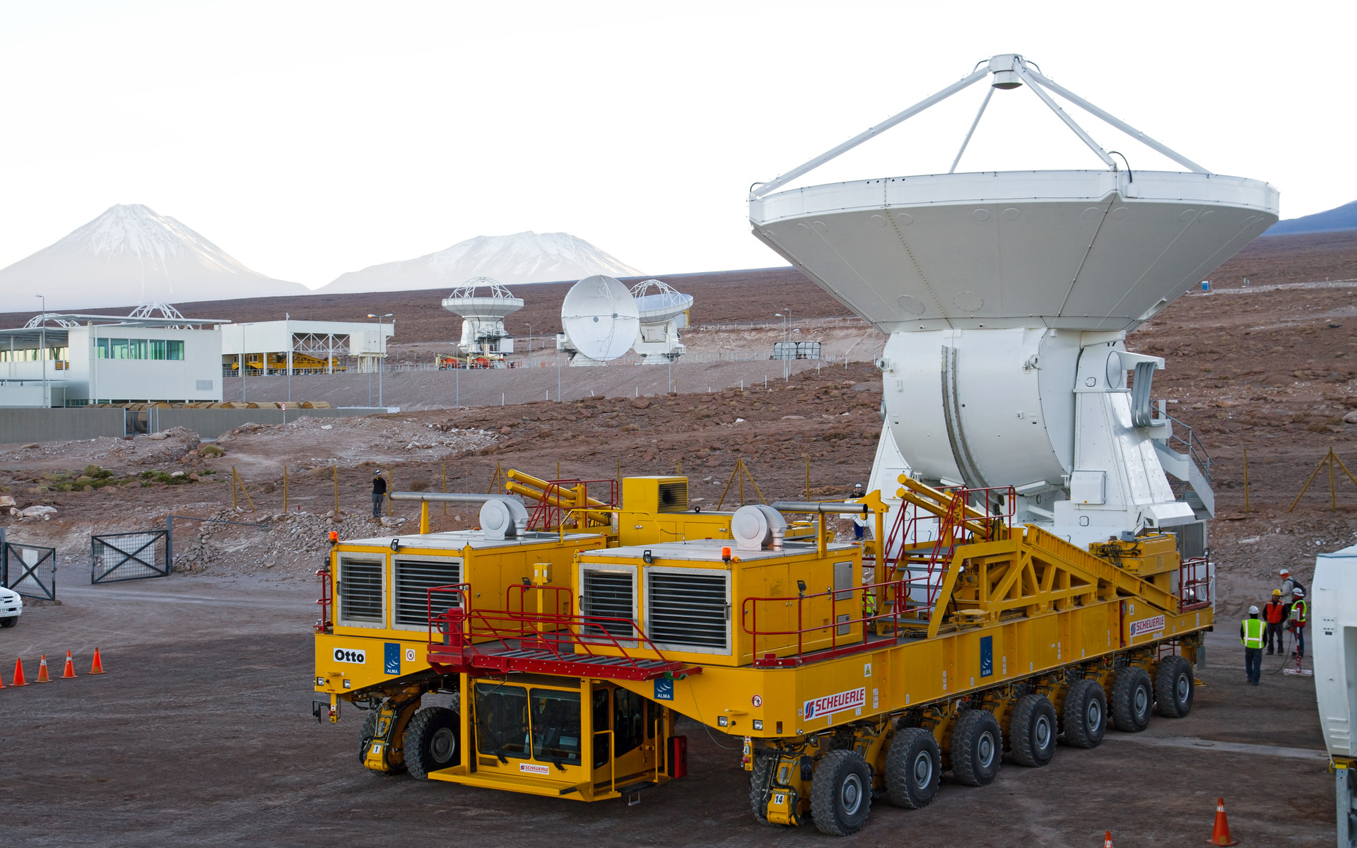The first European antenna for ALMA is moved the short distance from the Site Erection Facility, where it was assembled, to the Operations Support Facility on one of the giant yellow ALMA transporter vehicles. The two sites are next to each other, at an altitude of 2900 metres in the foothills of the Chilean Andes. This short trip marks the handover of the antenna from the AEM Consortium (Thales Alenia Space, European Industrial Engineering, and MT-Mechatronics), who built it, to the ALMA Observatory. The antenna weighs about 95 tonnes, and its dish has a diameter of 12 metres. It joins other antennas provided by the North American and East Asian ALMA partners. After testing at the OSF, it will be moved up to the 5000-metre Chajnantor plateau, where the ALMA telescope is taking shape.