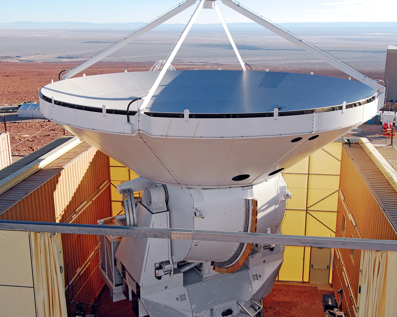 The AEM consortium has recently completed the full assembly of the first two European antennas within their camp at the ALMA Operations Support Facility (OSF). The picture shows the complete AEM antenna 2.