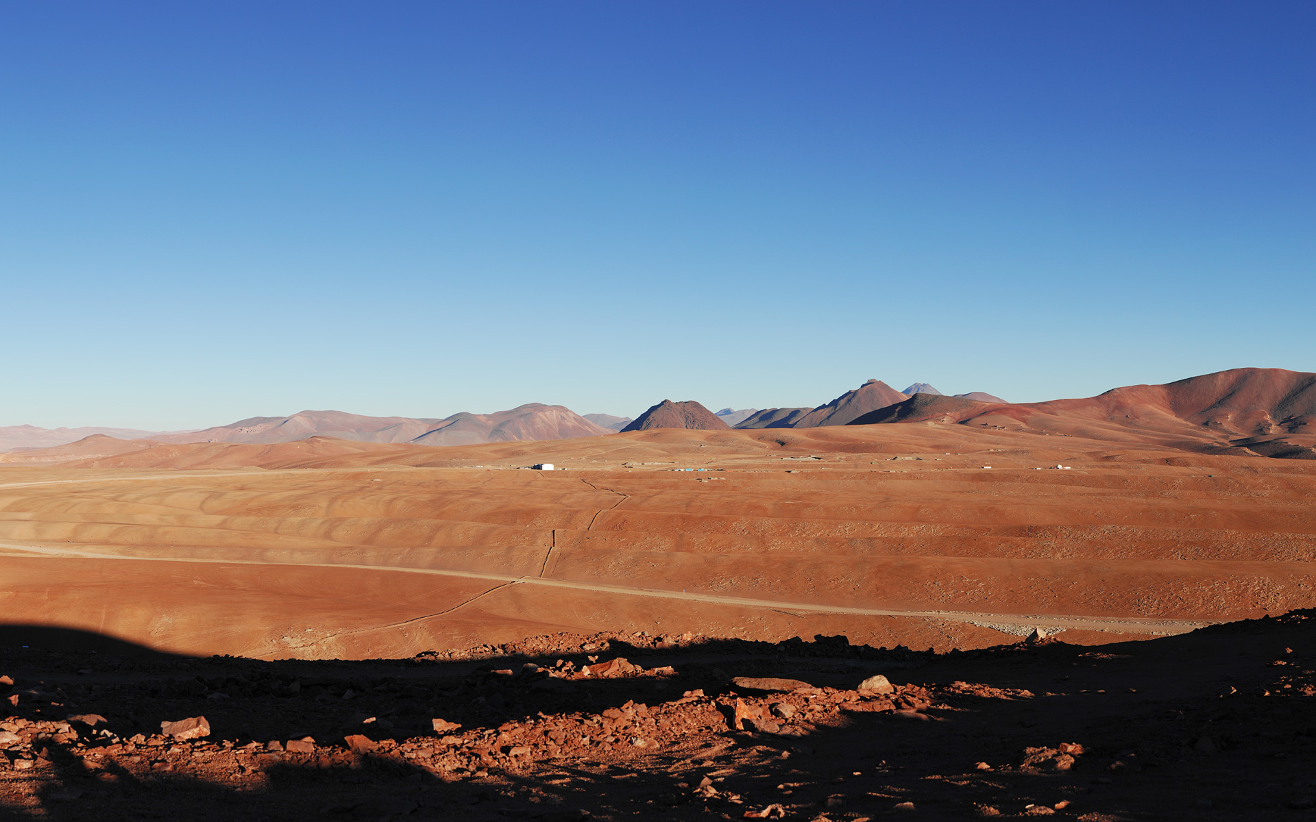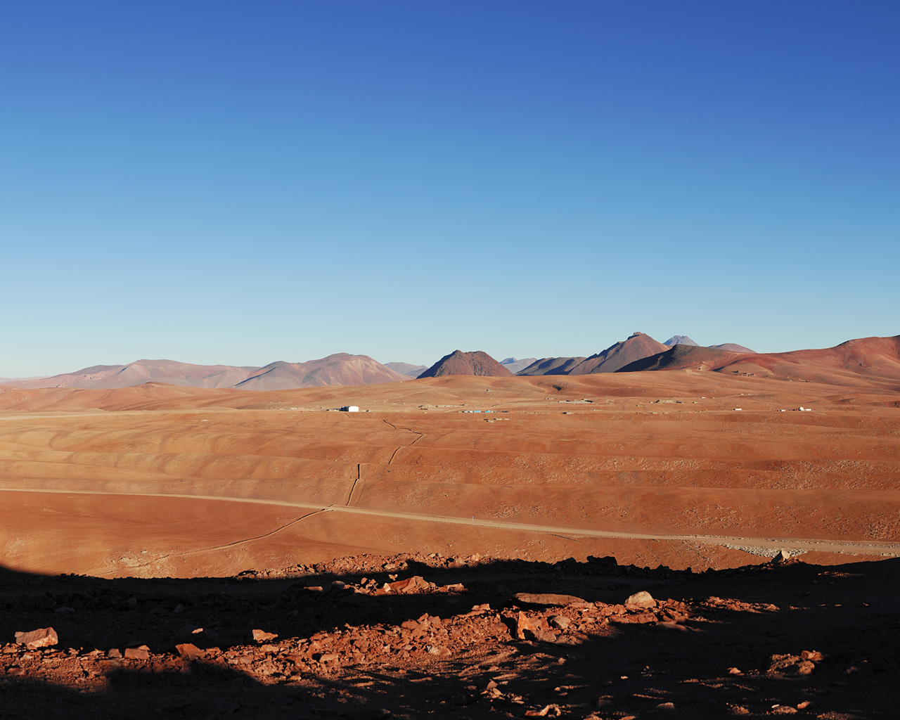 A view across the Chajnantor plain, high in the Chilean Andes, taken from Cerro Chico and looking towards the south, with the Moon visible in the sky. This 5000 metre high, arid plateau is where ESO and its international partners are currently building the Atacama Large Millimeter/submillimeter Array (ALMA), the largest astronomical project in existence. ALMA is a revolutionary astronomical telescope, comprising an array of 66 giant 12-metre and 7-metre diameter antennas observing at millimetre and submillimetre wavelengths. The positions of the 12-metre antennas will be reconfigurable, with almost 200 possible antenna positions spread over 18 kilometres on the plateau. The centre of the ALMA antenna array will be located close to the centre of this image – not far from the technical building visible in the background. The Atacama Pathfinder Experiment (APEX) 12-m submillimetre telescope is seen to the left of the image, in front of Cerro Chascón. The road to the 2,900-metre-high Operation Support Facility is to the right of the image.