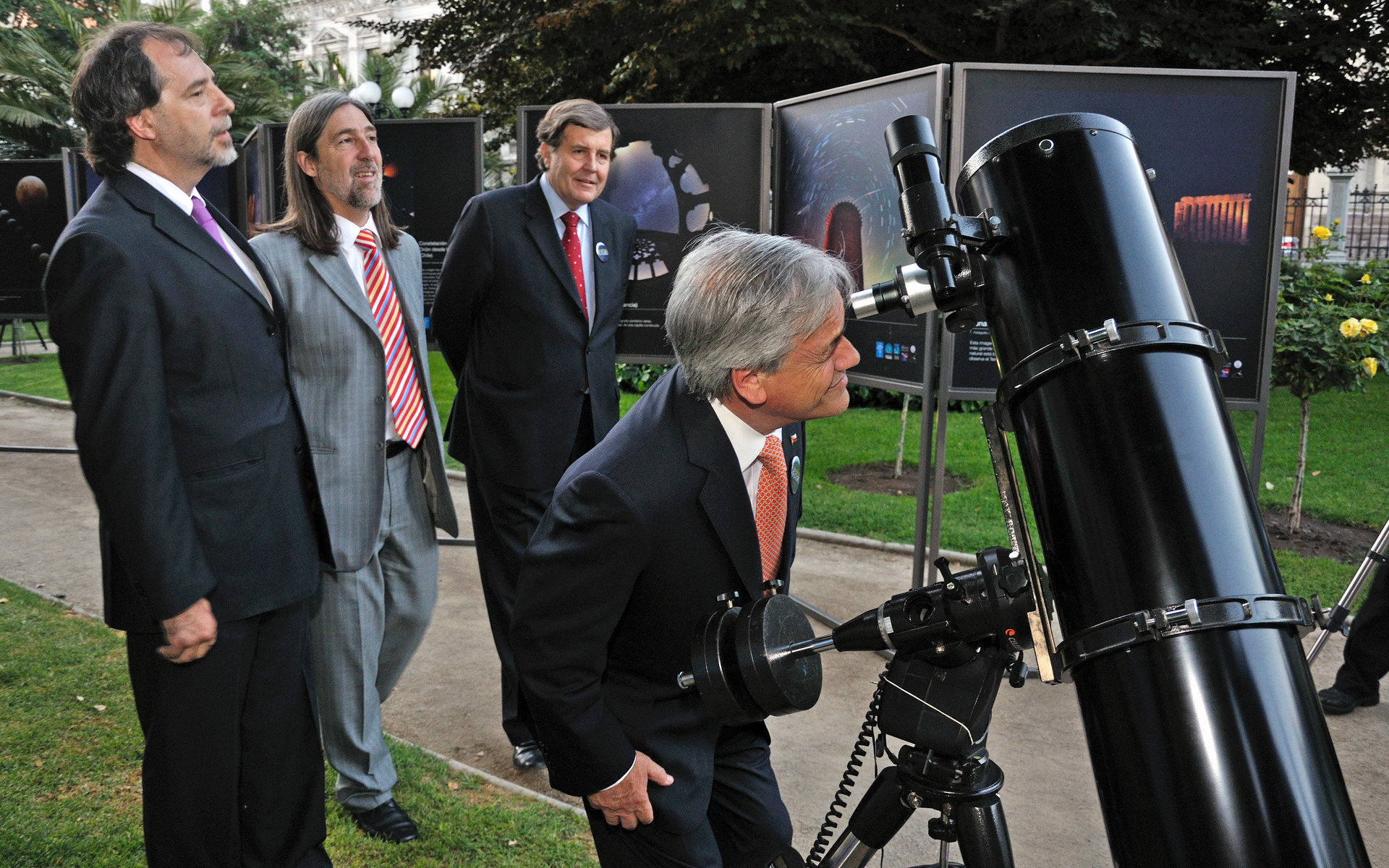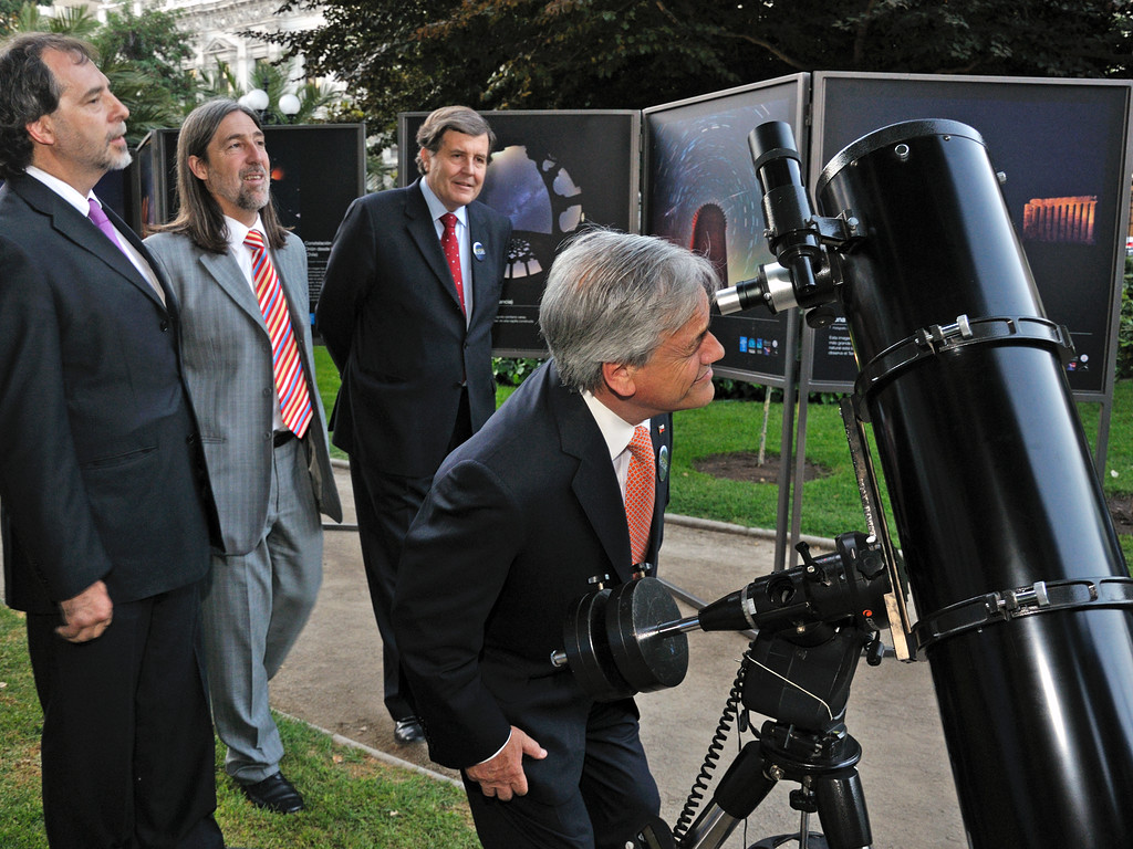 In the picture, President Piñera observes the Moon with amateur telescopes provided by ESO, accompanied by the President of the Chilean Senate, Guido Girardi (left), the President of the Chilean House of Representatives, Patricio Melero (right), and the Vice-President of the Senate, Juan Pablo Letelier (centre).