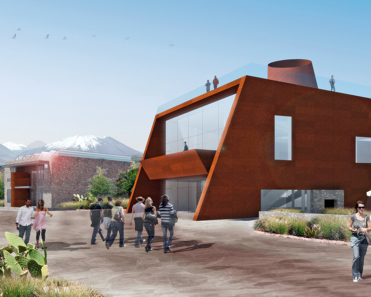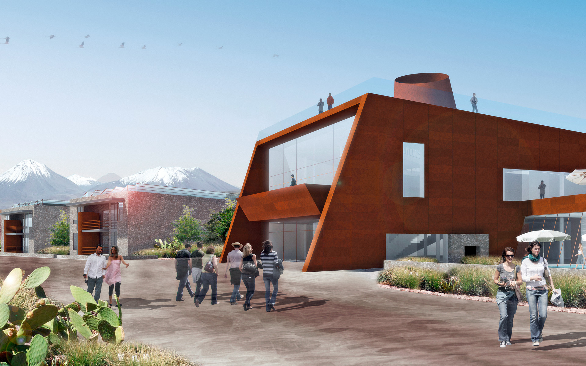 This illustration of the ALMA hotel residence shows a view towards the main building, which will provide communal areas for the staff working at the observatory. Behind the main building are some of the dormitory modules. The residence will be built at ALMA's Operations Support Facility, at an altitude of 2900 metres in the foothills of the Chilean Andes. In the background, the distinctive conical shape of the Licancabur volcano can be seen.
