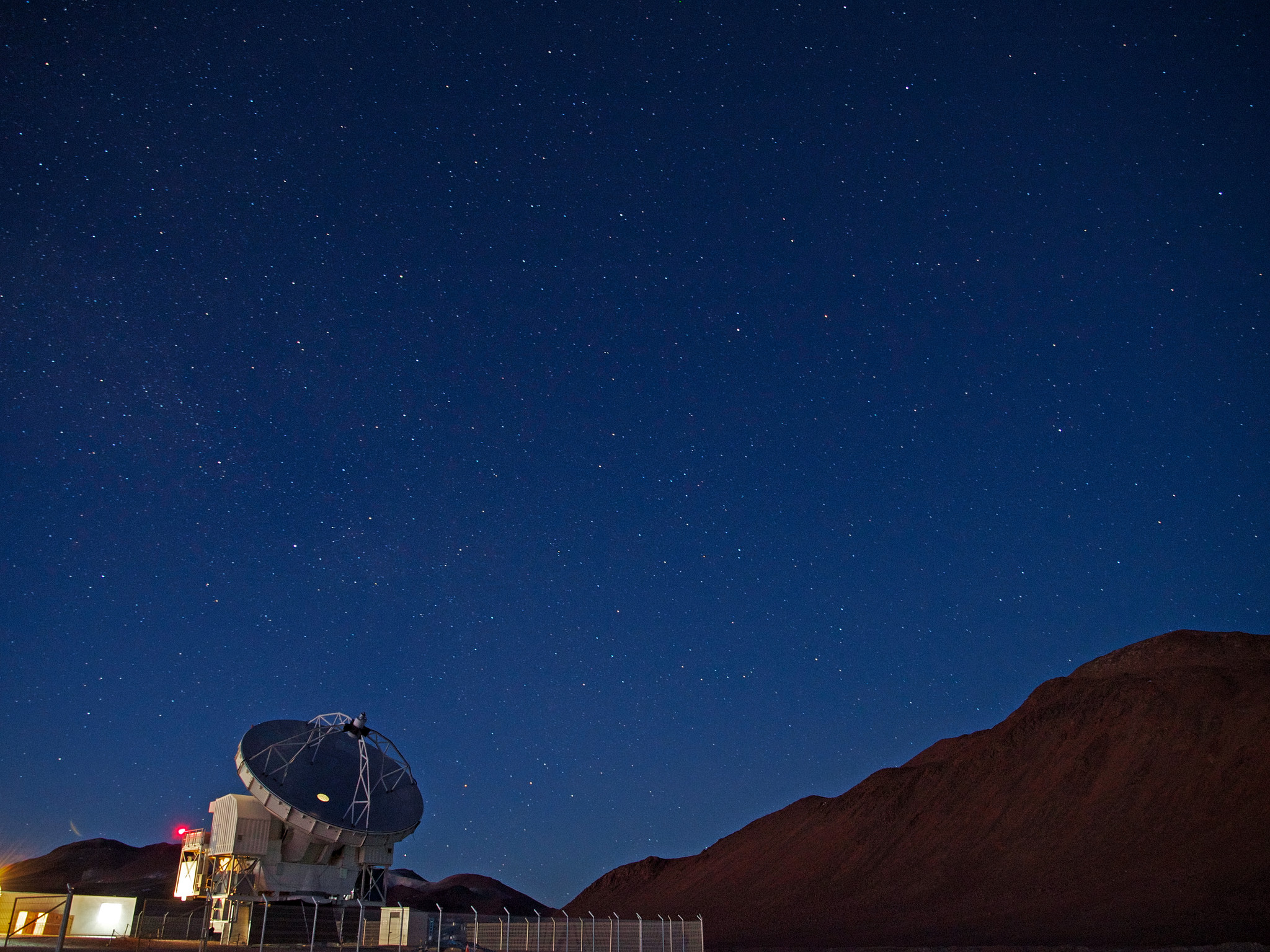 The APEX Telescope under the starry sky, at an altitude of 5100 metres on the Chajnantor plateau, in the Chilean Andes. APEX, the Atacama Pathfinder Experiment, is a 12-metre antenna that observes the Universe at millimetre and submillimetre wavelengths. In the background on the right is the 5600-metre-high Cerro Chajnantor.