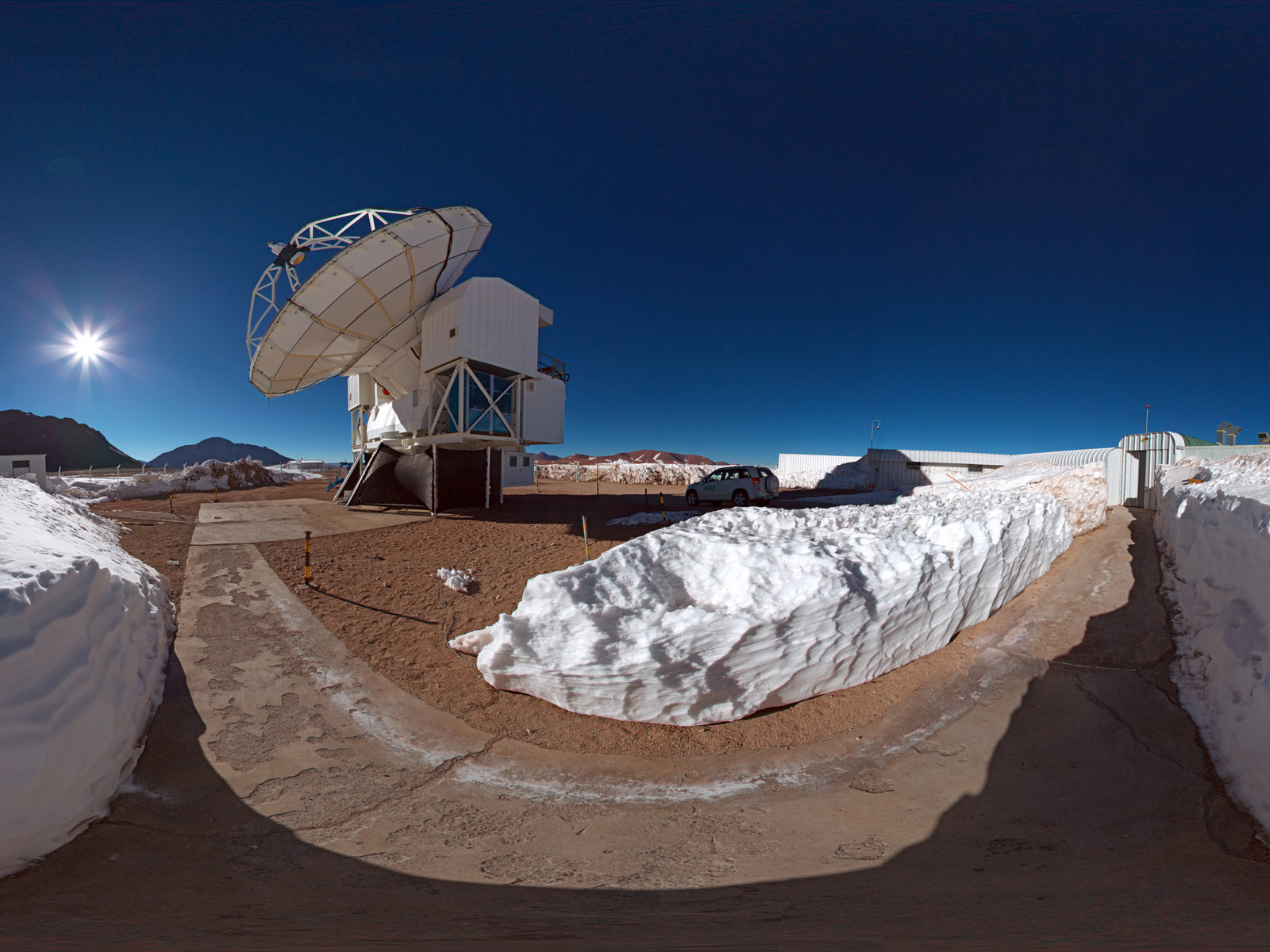 This panorama shows the surroundings of APEX, the Atacama Pathfinder Experiment telescope on the Chajnantor plateau in Chile's Atacama region, 5,100 metres above sea level. APEX is observing the cold and distant Universe for astronomers. At one of the highest observatory sites on the planet, the weather conditions are extreme.