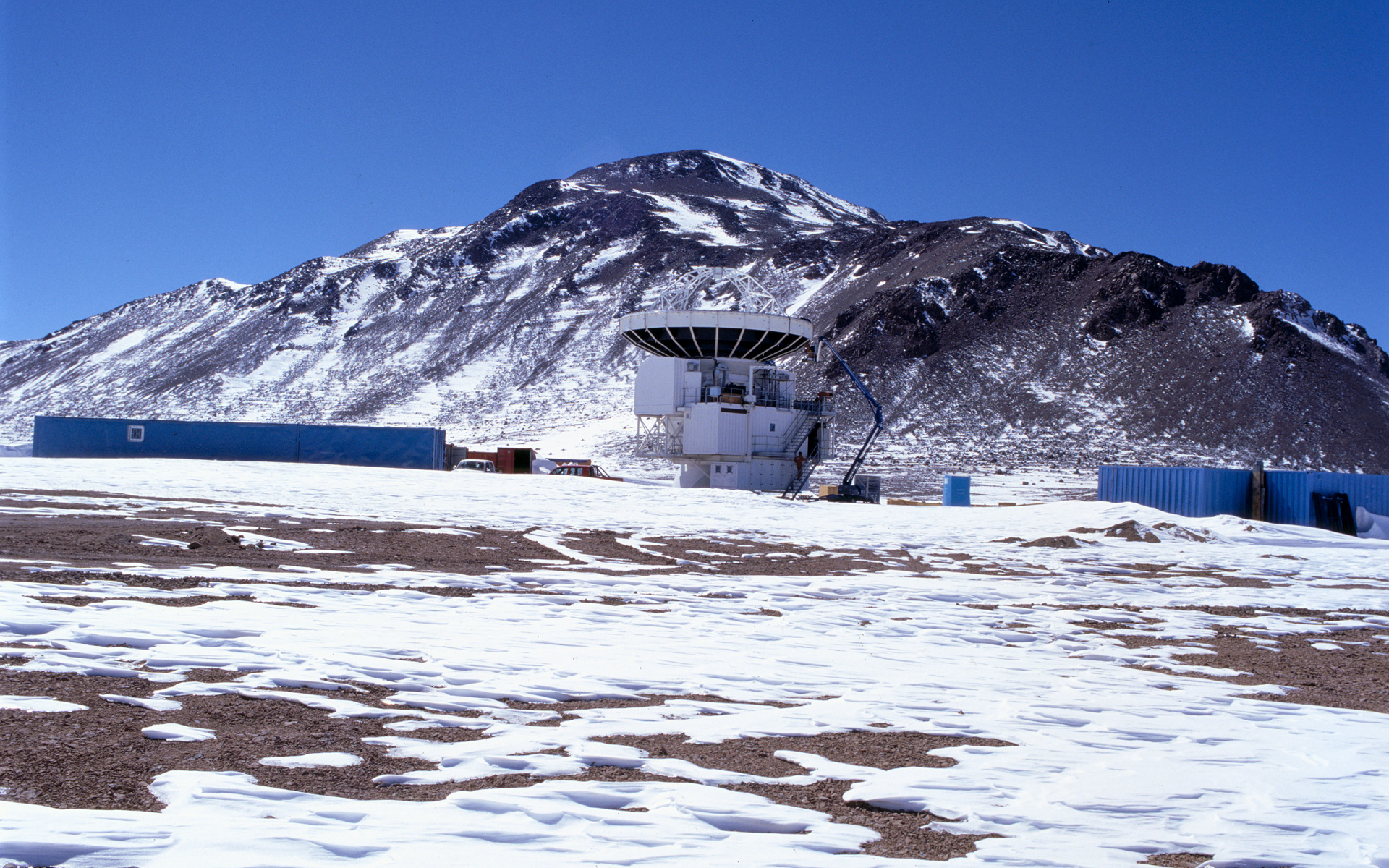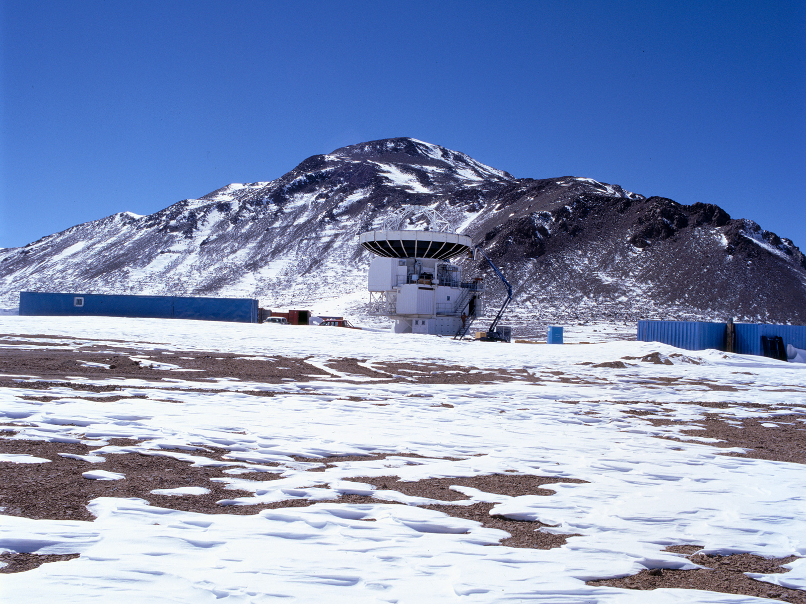 A view of the APEX antenna on the Chajnantor site at an altitude of 5,104 m in the Chilean Atacama desert.