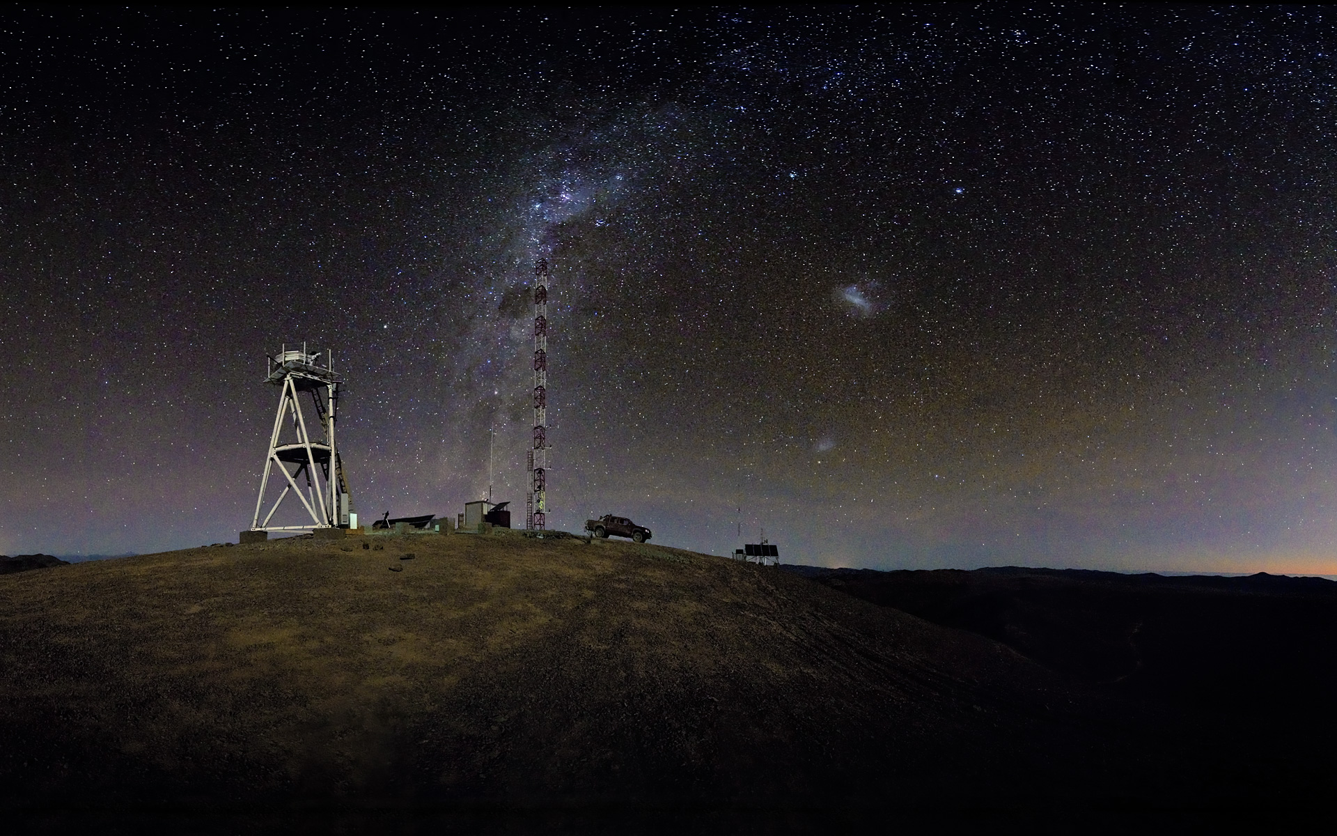 Spectacular 360° nighttime panorama taken from Cerro Armazones, a 3060-metre mountain in the II Region of Chile. Cerro Armazones is the selected site for the planned European Extremely Large Telescope (E-ELT), and is about 20 km away from Cerro Paranal, home of the ESO Very Large Telescope (VLT). On the right of the image, the Moon is setting over the Pacific Ocean, which is only about 30 km away. In the centre of the image is the Milky Way, where the Carina Nebula and the dark “Coal Sack” nebula are visible. On the right-hand side of the Milky Way are two of our neighbouring galaxies: the Large and the Small Magellanic Clouds.