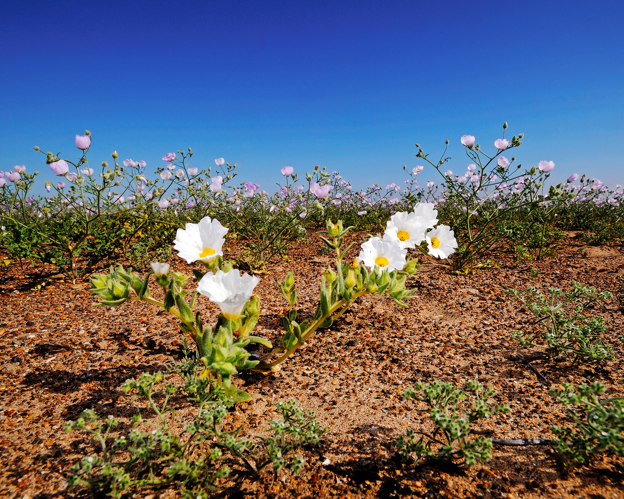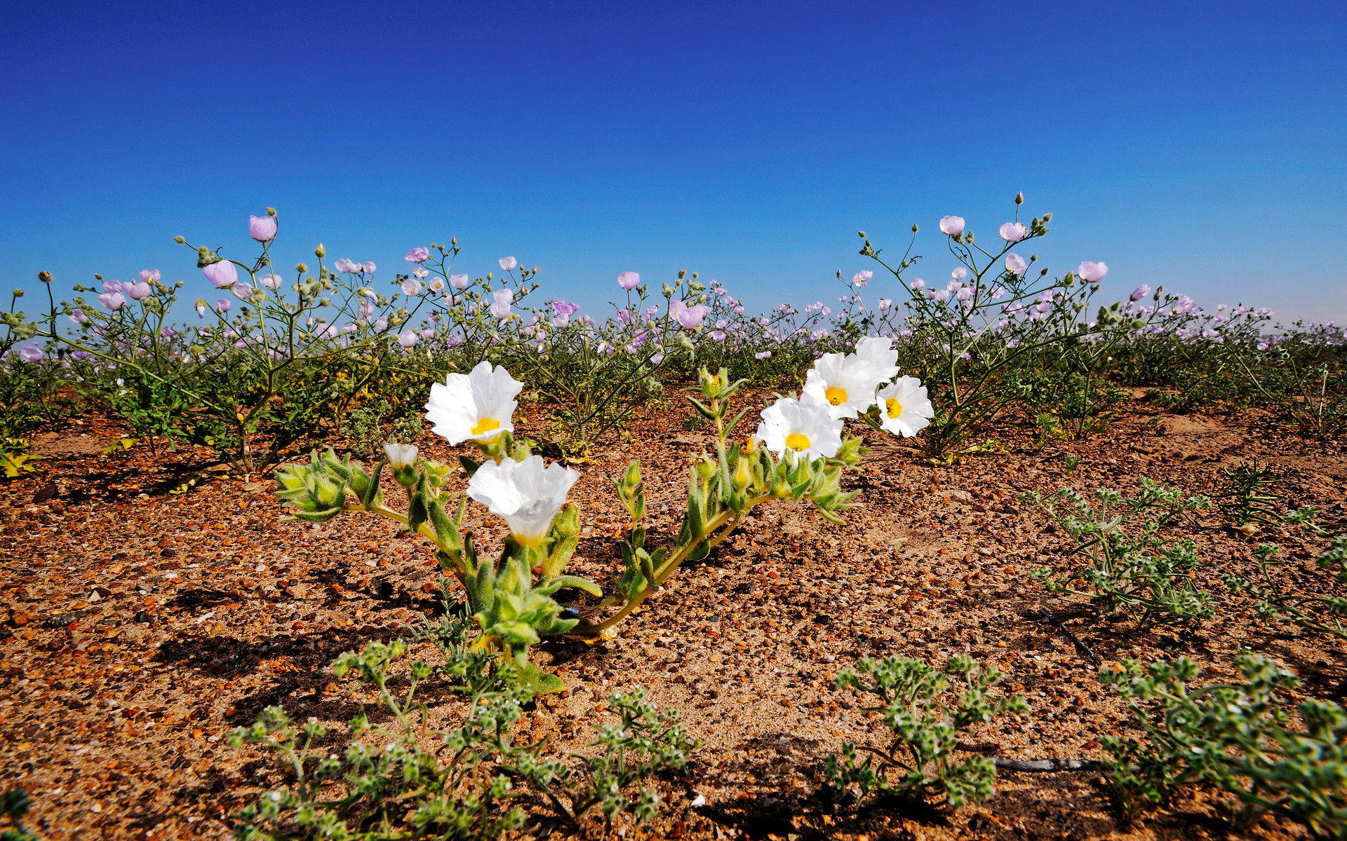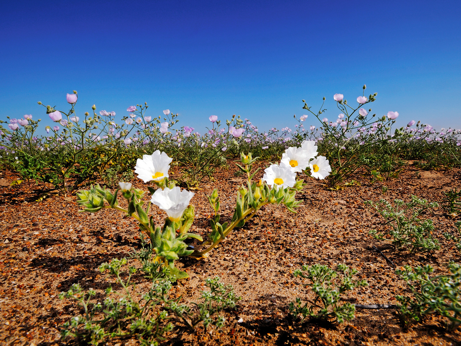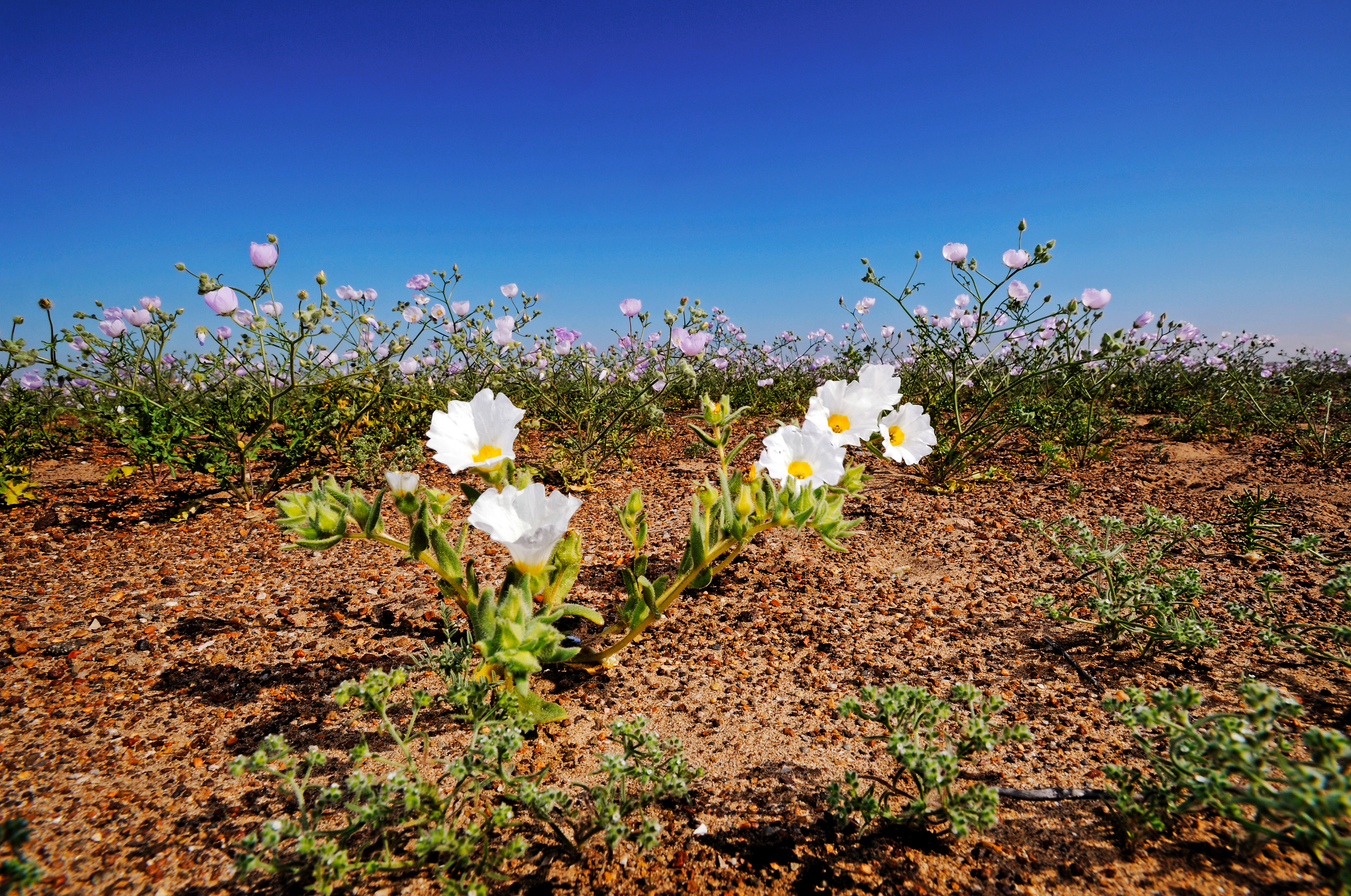 Beautiful white wild flowers, colour's explode in Chile's Atacama Desert.