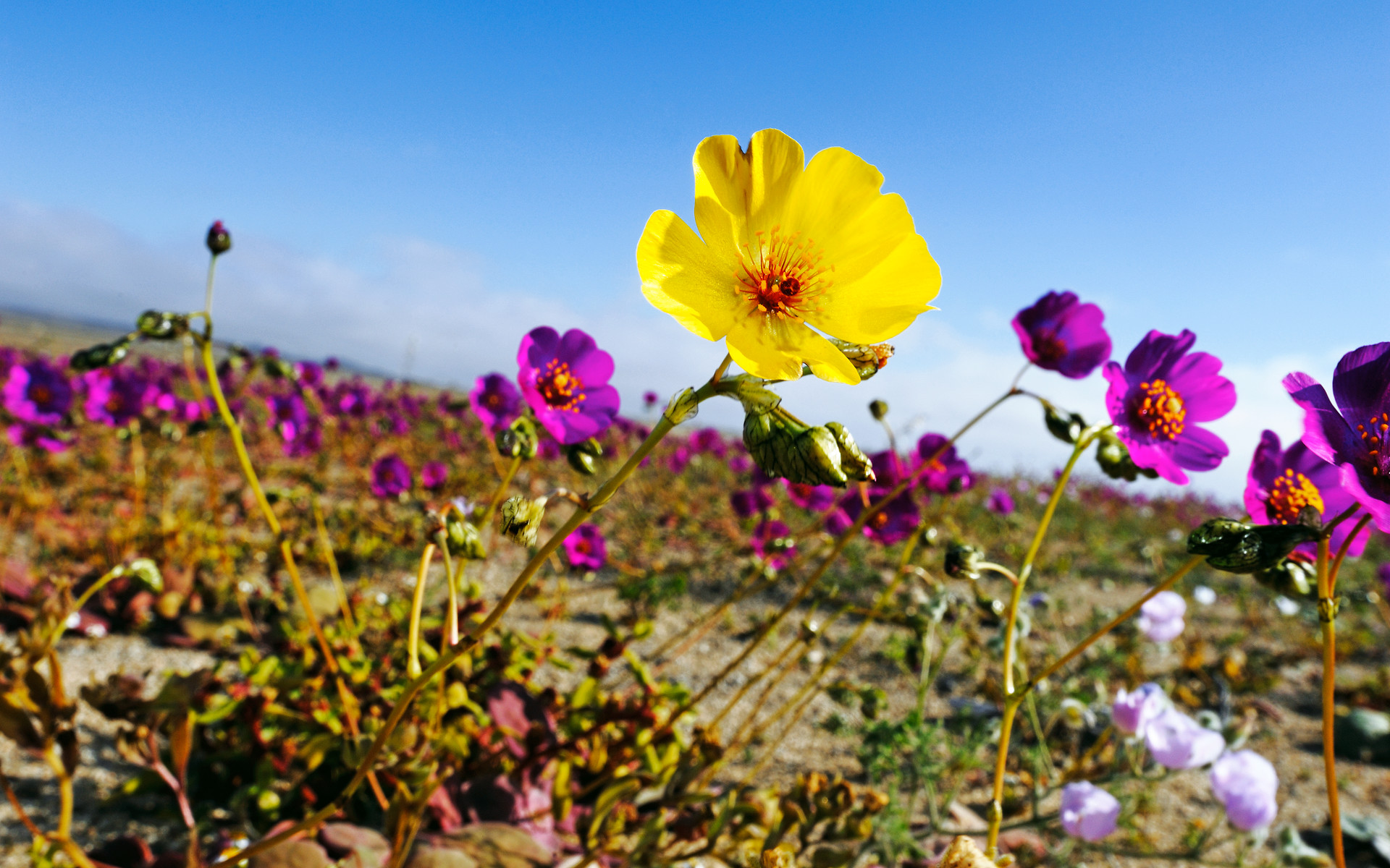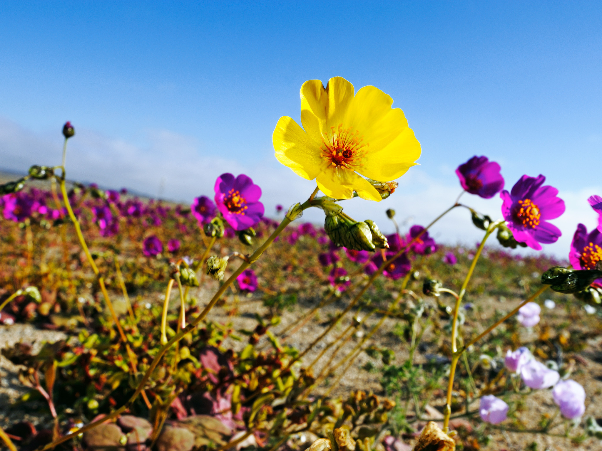 A beautiful yellow flower hidden between a full field of purple ones in the Atacama Desert, one of the driest places on Earth.