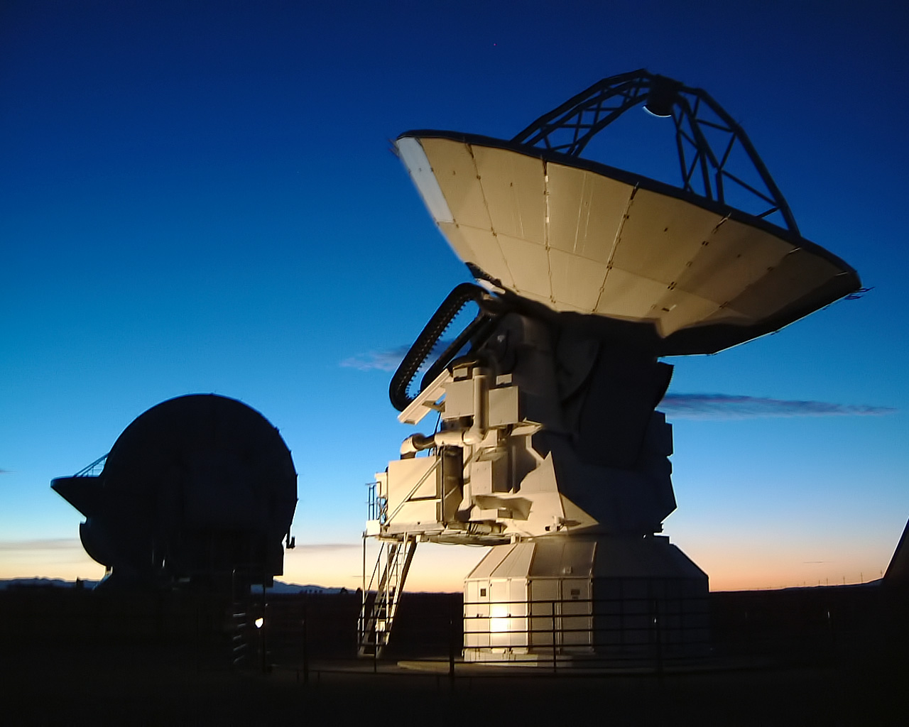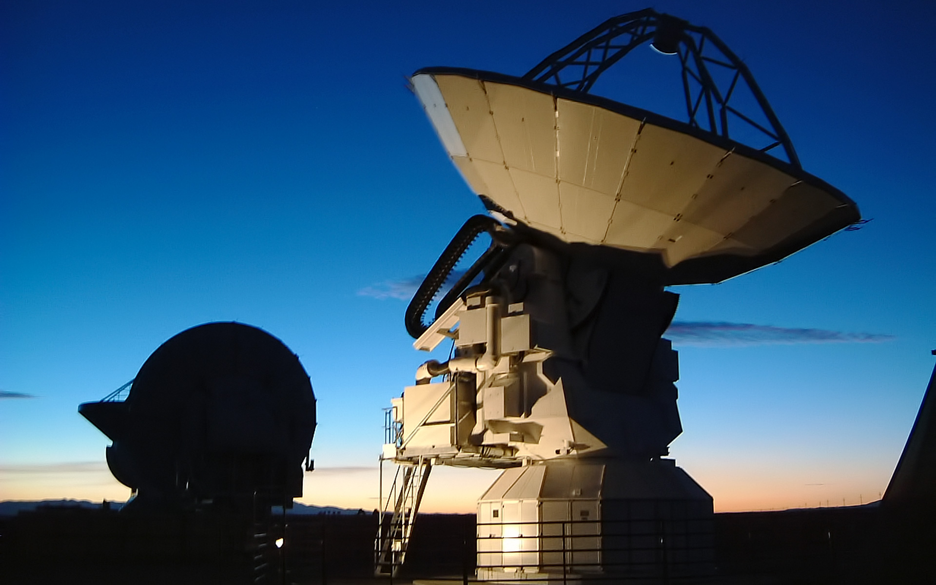 In the foreground of this image is a 12-metre diameter antenna. This antenna and its sisters — one of which is silhouetted behind— make up the Atacama Large Millimeter/submillimeter Array (ALMA).