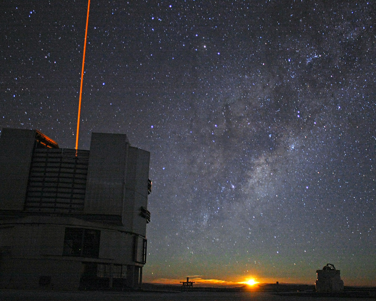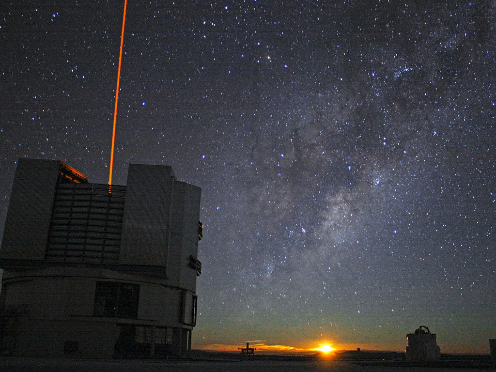 The Moon is just rising in this image where Yepun, Unit Telescope 4, is shooting a laser beam.