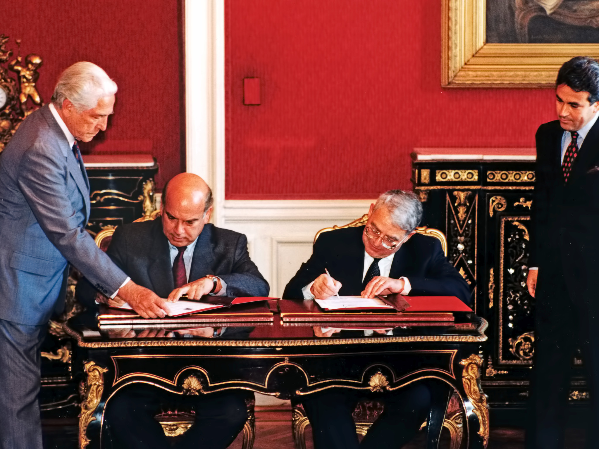 On December 2, 1996, the Minister of Foreign Affairs of the Republic of Chile, Mr. Miguel Insulza (seated to the left in the photo), and the Director General of ESO, Professor Riccardo Giacconi (right), exchanged in Santiago de Chile the Instruments of Ratification of a new Interpretative, Supplementary and Amending Agreement to the 1963 Convention between the Government of Chile and the European Southern Observatory.