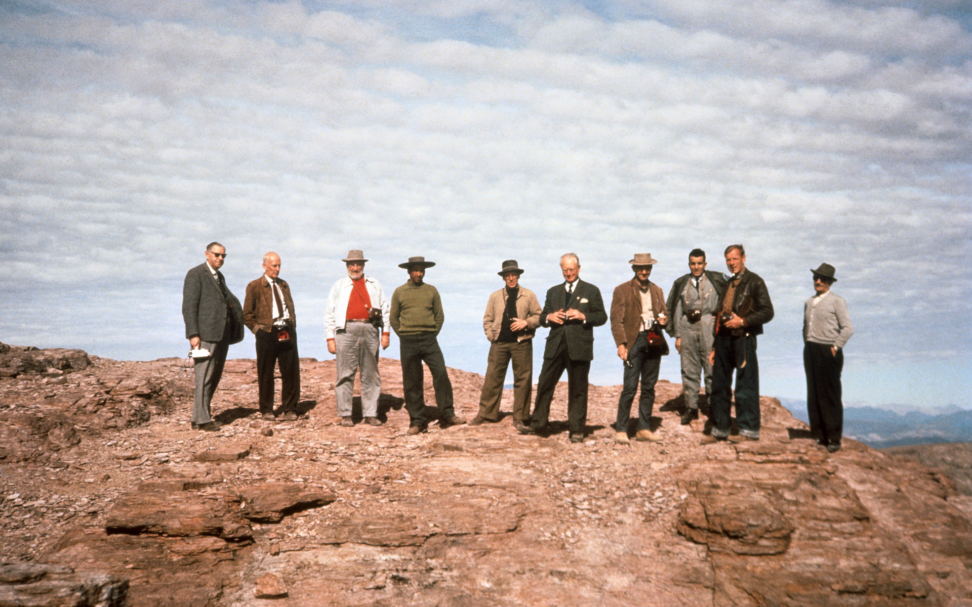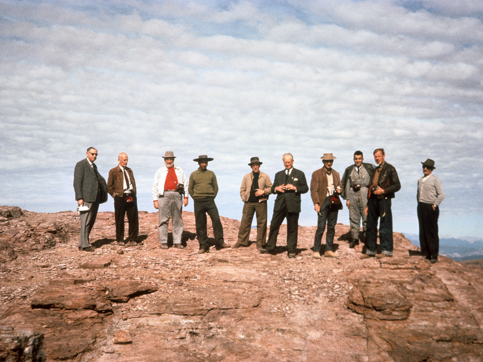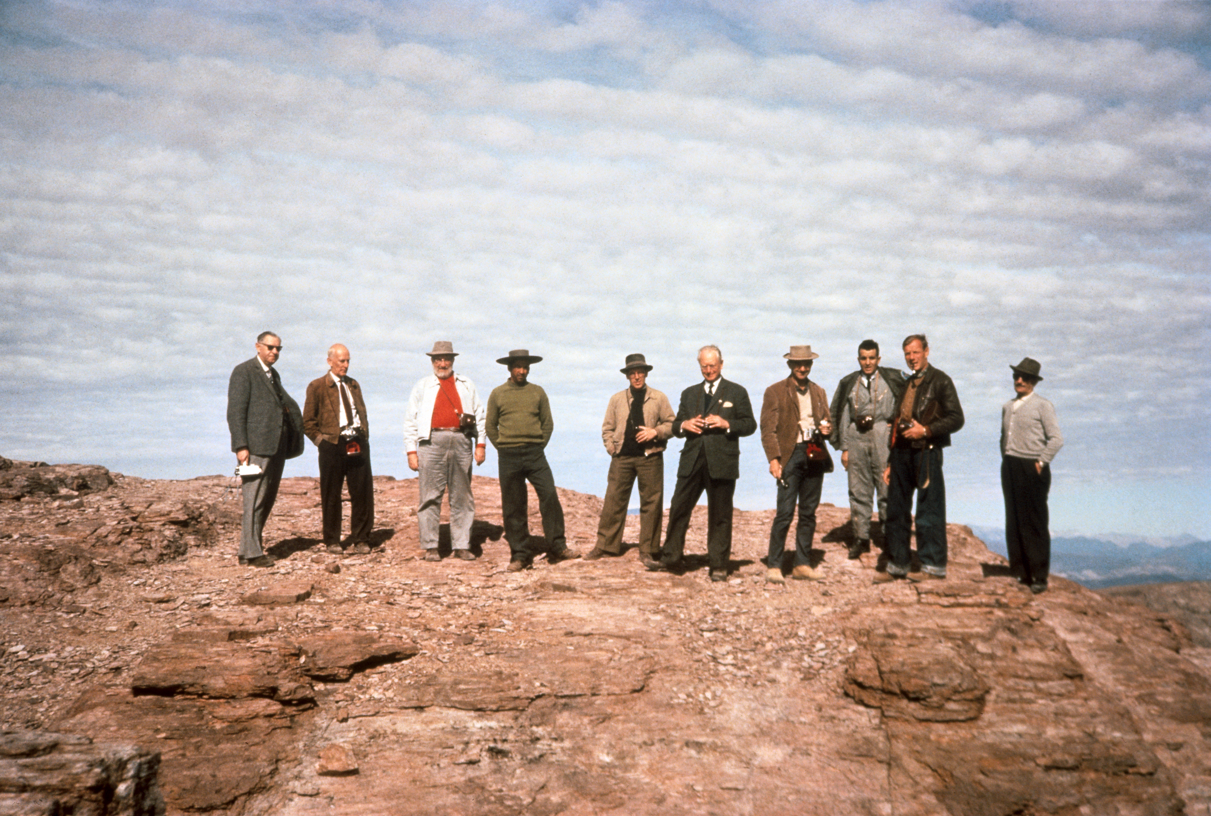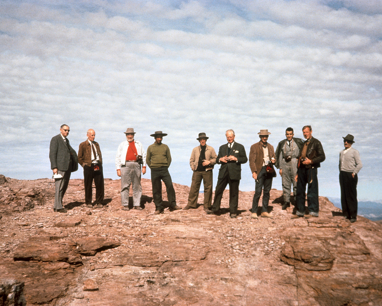 On June 8-10 1963, ESO officials were the guests of AURA on their property and on June 10 gathered on Morado, discussing ESO prospects in Chile. From left to right: H. Siedentopf, J.H. Oort, F.K. Edmondson, tour guide (unidentified), A.B. Muller, O. Heckmann, Ch. Fehrenbach, two unknown persons and Sr Marchetti (architect, on the far right). Participating in the mission to Chile in June 1963 were: J. H. Oort (Chairman of the ESO Committee), O. Heckmann (ESO's Director), Ch. Fehrenbach (Chairman of the Instrumentation Committee), H. Siedentopf (Chairman of the Site Selection Committee) and A. B. Muller (Superintendent of the ESO activilies in Chile). Also came to Chile F. K. Edmondson (President of AURA), N. U. Mayall (Director of Kitt Peak Observatory), and J. Stock, who by that time had become Director of Cerro Tololo Inter-American Observalory.