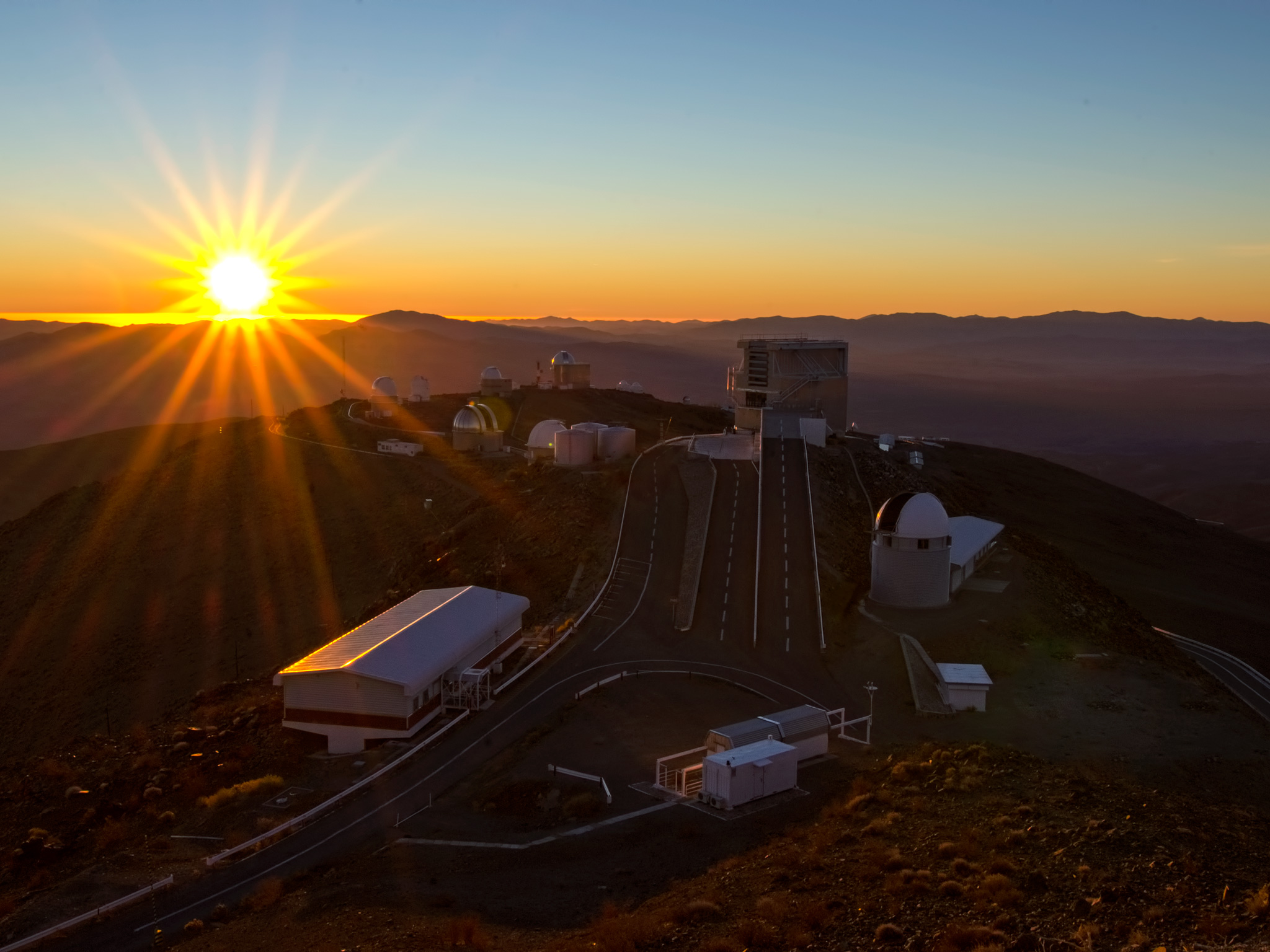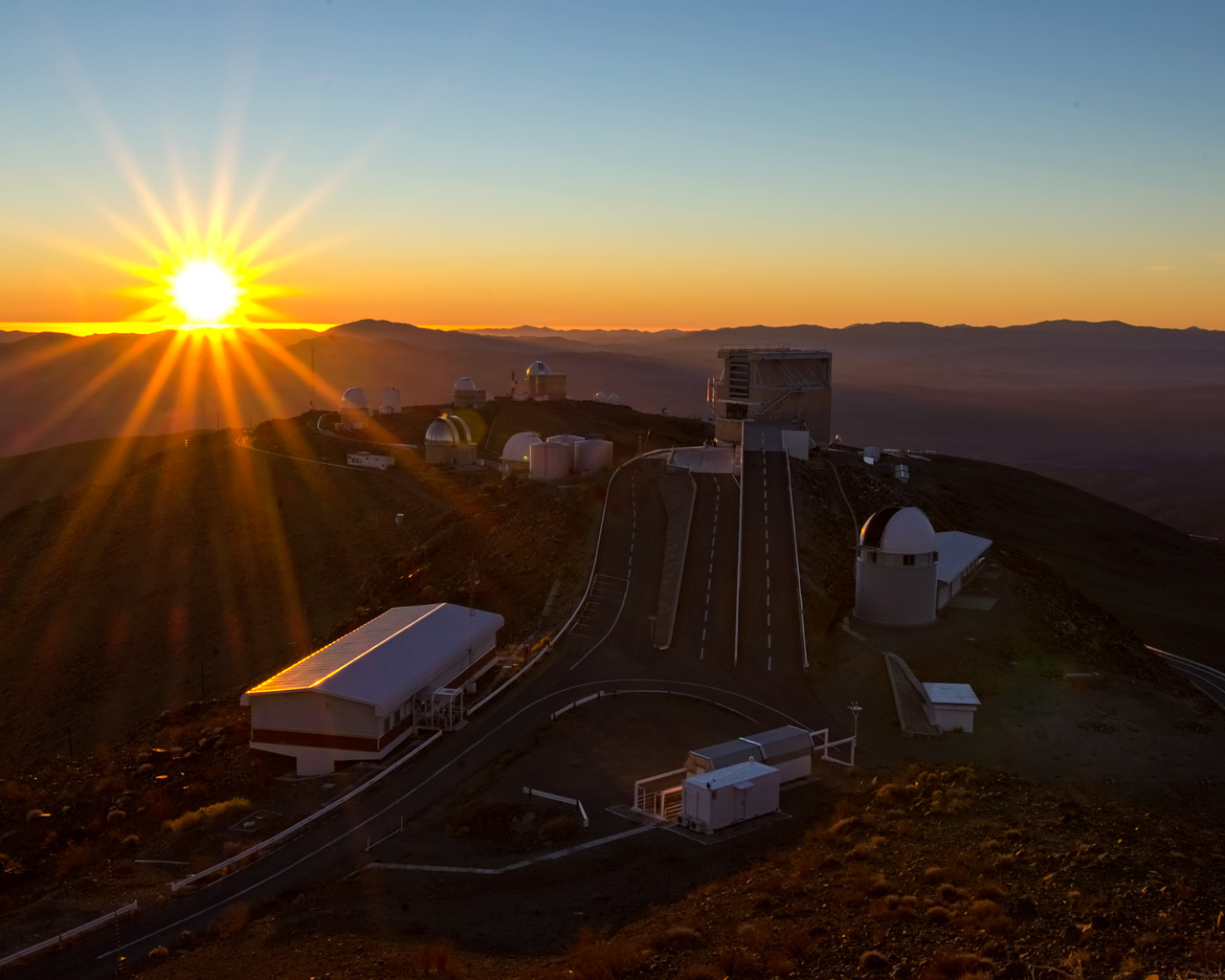 Evening view of ESO's La Silla observatory in Chile. The dome of the Swiss 1.2-m Leonhard Euler Telescope and the adjacent building are seen in the foreground, immediately to the right of the ramp leading to the ESO 3.6-m New Technology Telescope (NTT) in its octogonal enclosure.