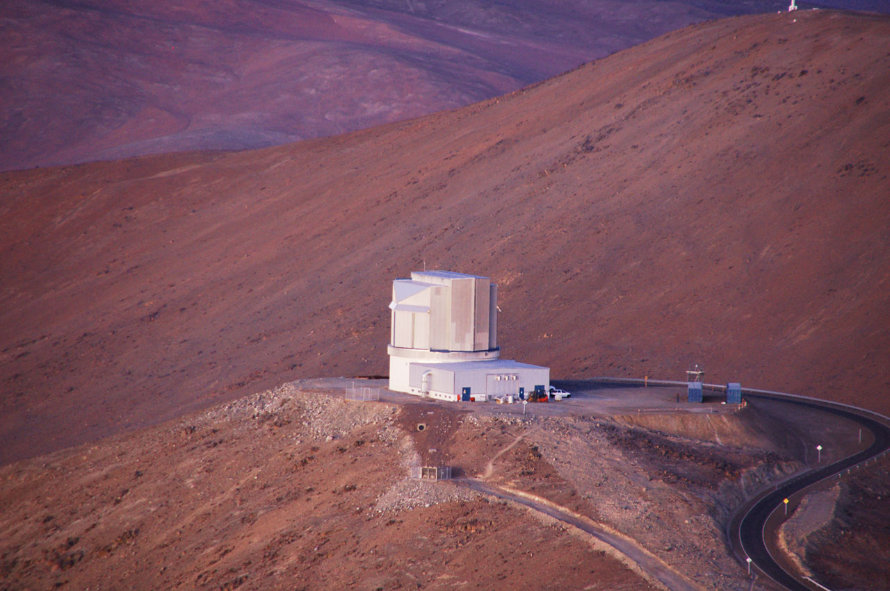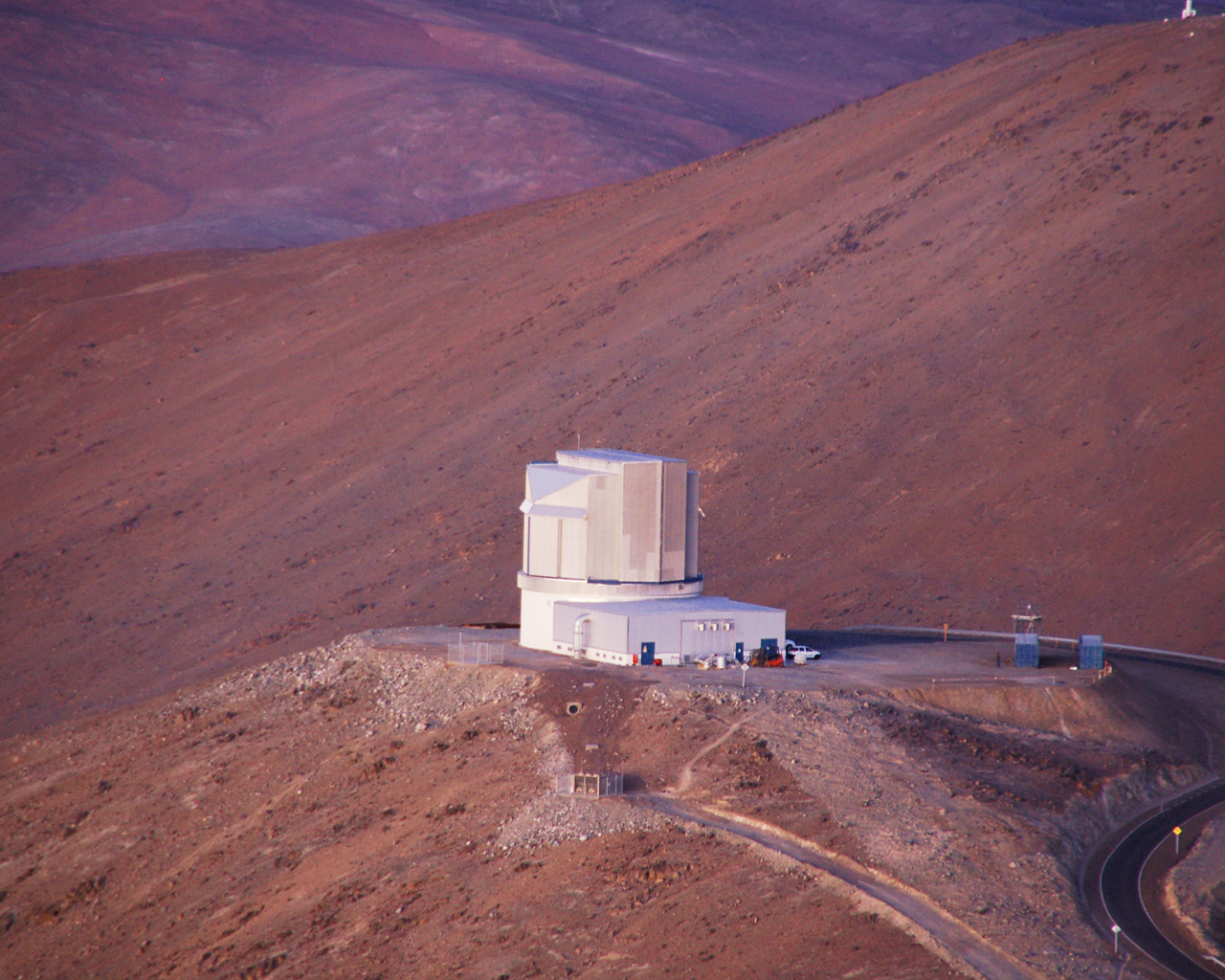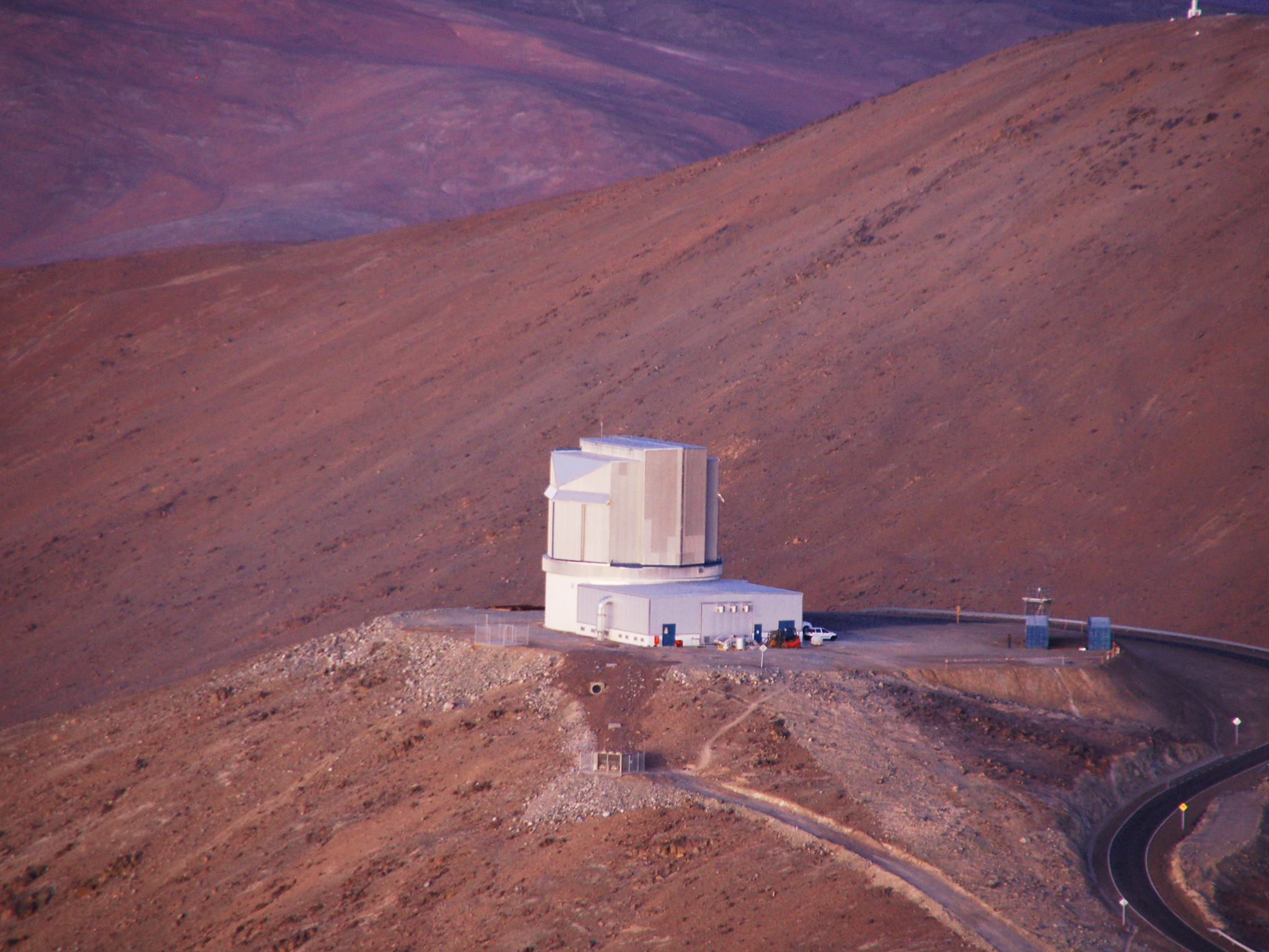 The Visible and Infrared Survey Telescope for Astronomy (VISTA) seen from above at its site on Cerro Paranal in Chile near the Very Large Telescope (VLT). VISTA has a main mirror that is 4.1 metres across, being by far the largest telescope in the world dedicated to surveying the sky at near-infrared wavelengths.