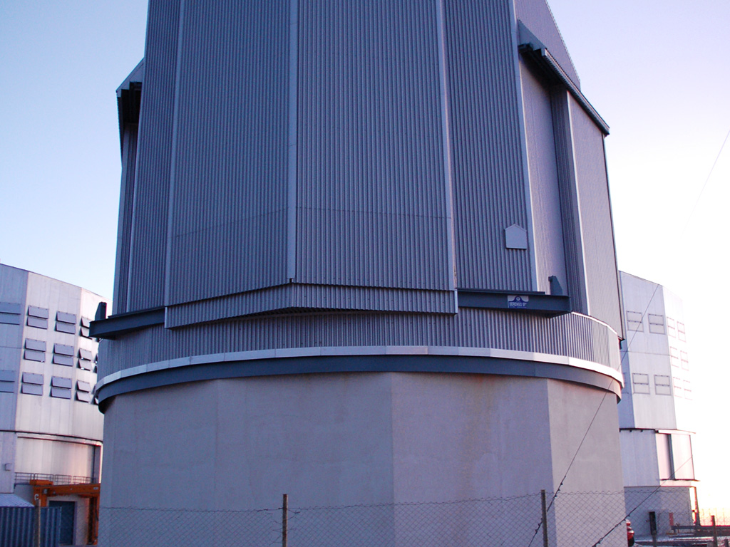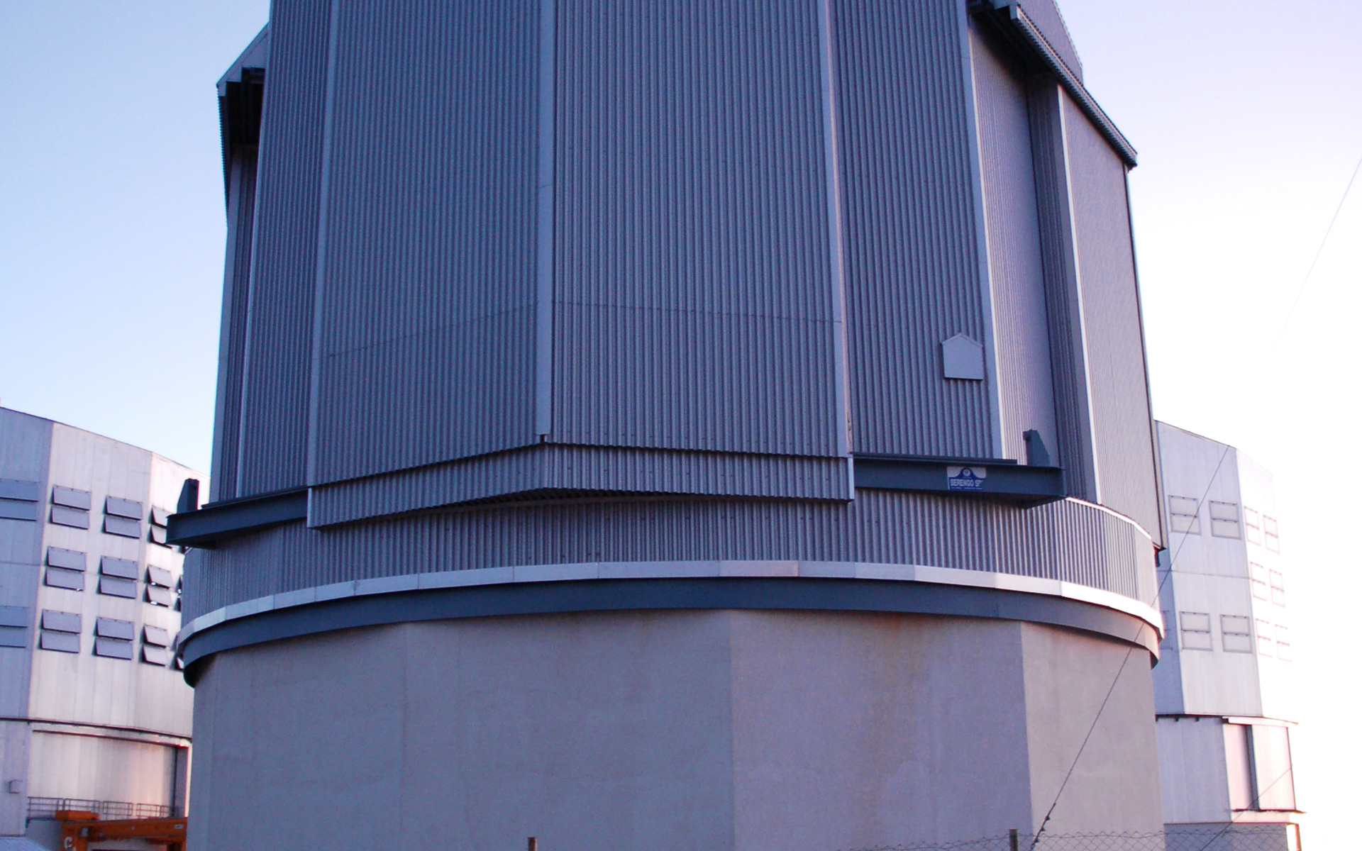 The 2.6m diameter VLT Survey Telescope (VST) in its dome at ESO's Cerro Paranal observing site. Located in the Atacama Desert of Chile, the site is over 2600 metres above sea level and provides exceptionally dry and dark viewing conditions. The VST is equipped with a giant CCD camera called OmegaCAM to take very wide-field images of the sky in visible light. It is used to survey broad regions of the sky and catalogue huge numbers of celestial objects.