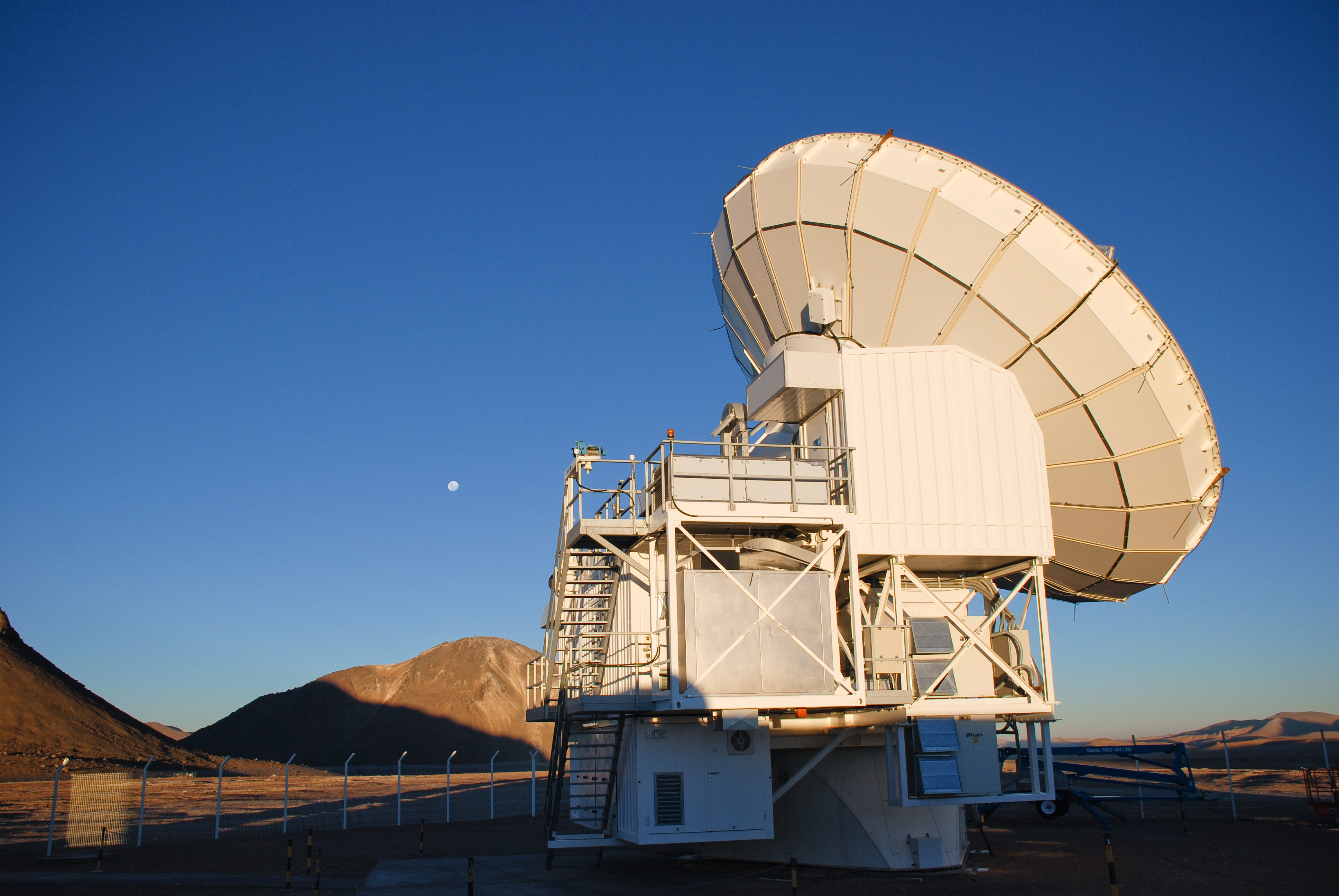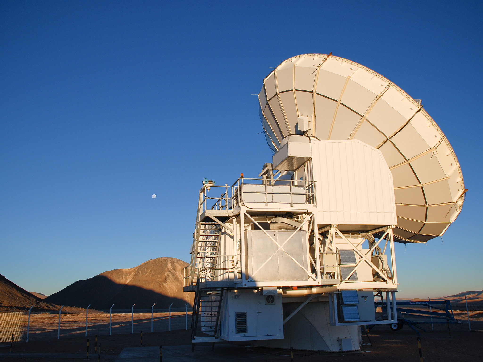 The APEX mirror, 12-metres in diameter, points toward the afternoon sky, seeming almost eager for the night’s observation run of milimetre and submilimetre wavelength astronomy from the Chajnantor plateau in Chile's Atacama region. APEX looks at the cold, dusty, and far distant Universe, often difficult to observe with other types of telescopes.