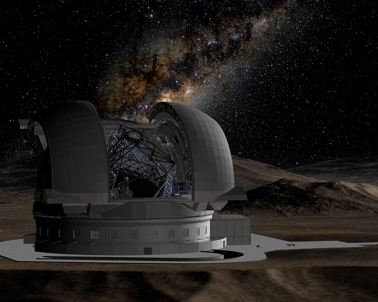 Artist’s impression of the E-ELT during observations. In the background the Center of the Milky Way is just rising above the Enclosure of the telescope.