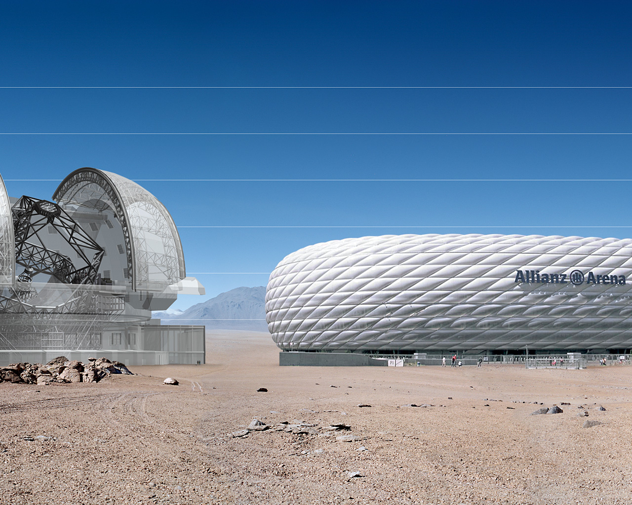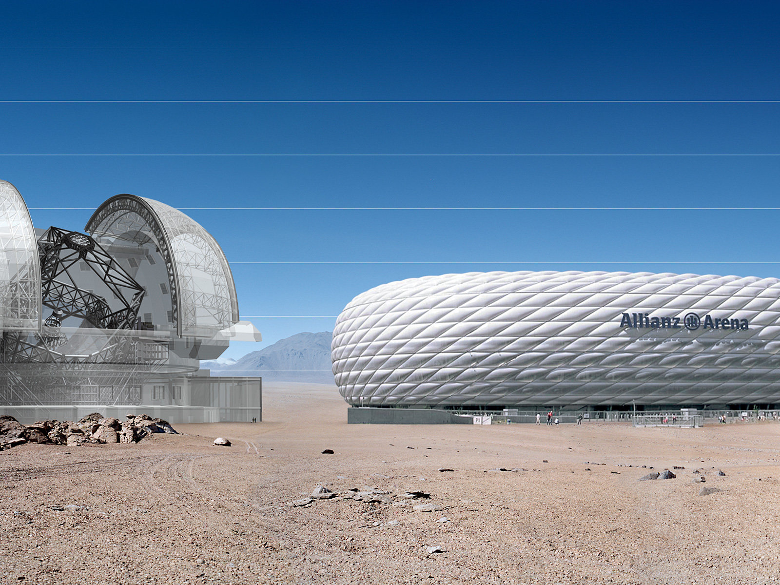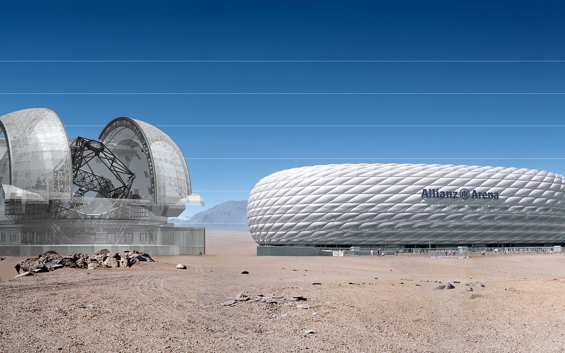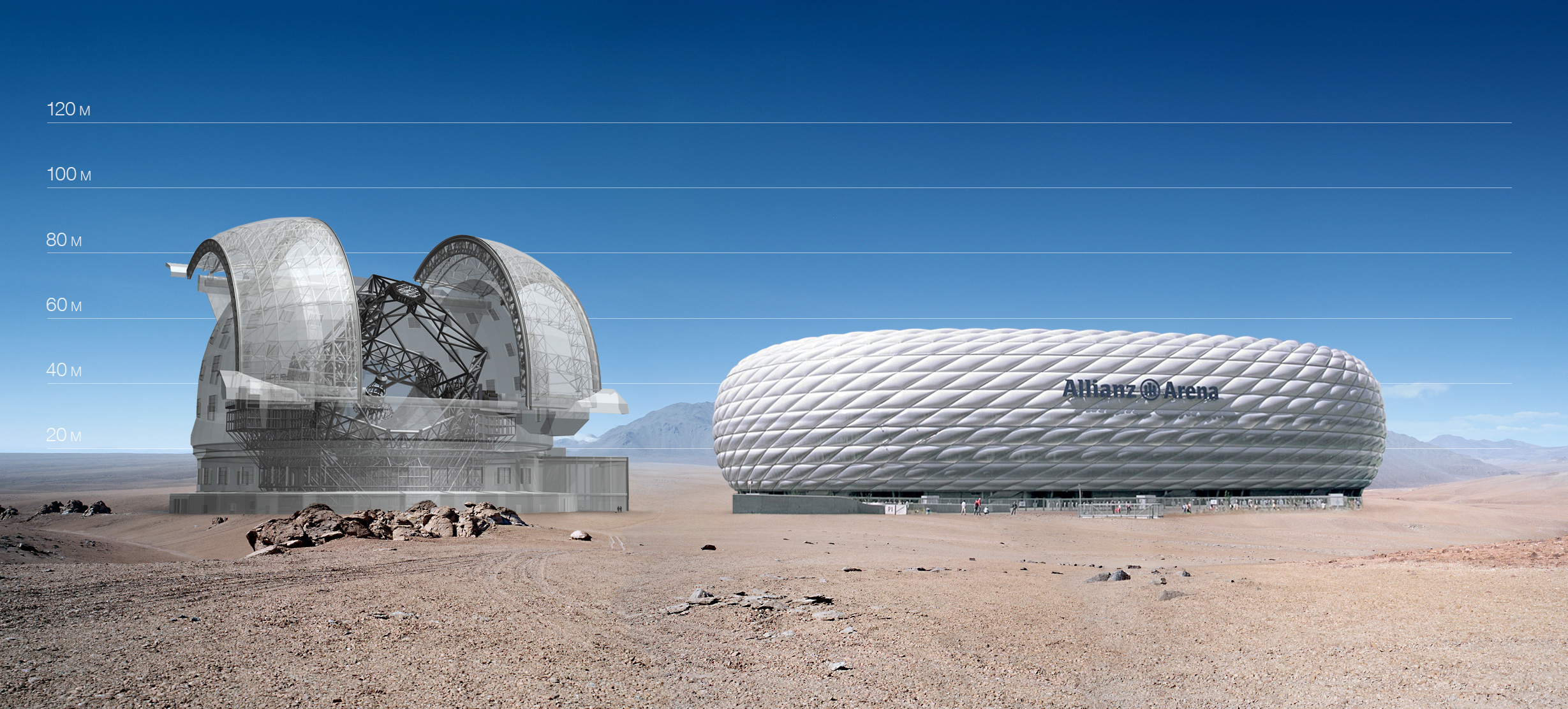 The E-ELT here seen in a scale comparison with Allianz Arena.
