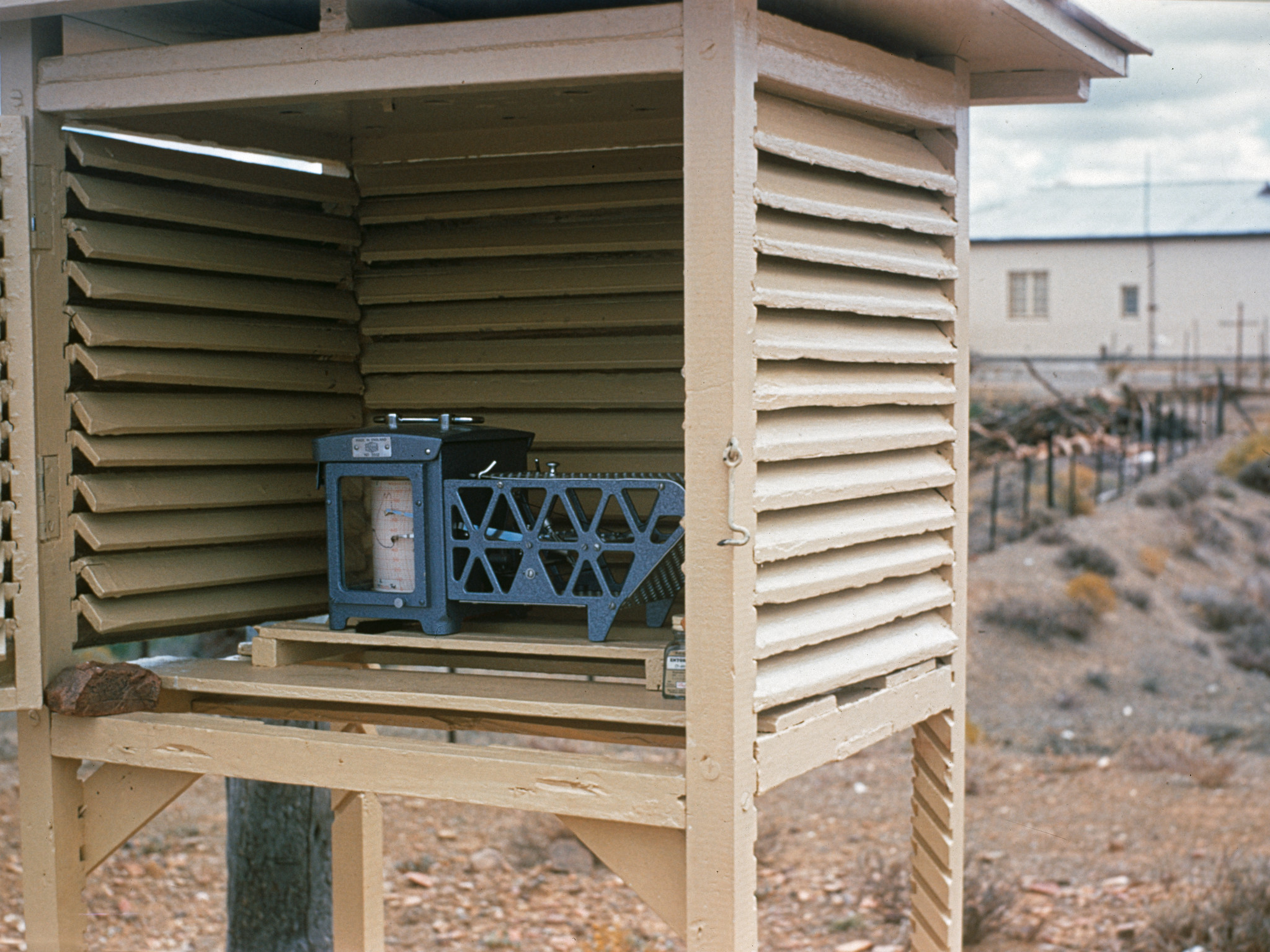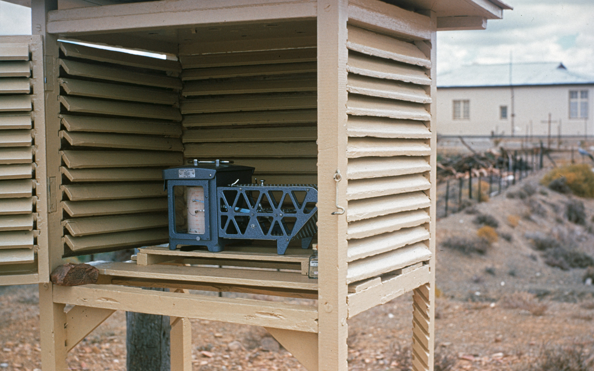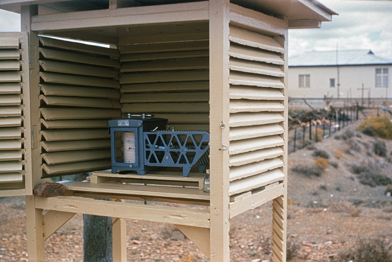 A weather station collects data at one of the locations (Zeekoegat or Klaverlei farm), tested in South Africa in the early 1960s.