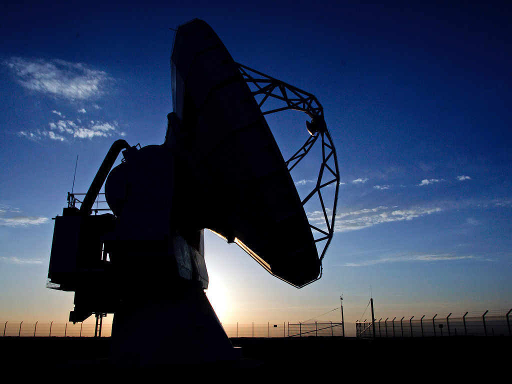 Silhouette of the Atacama Pathfinder Experiment (APEX) at Chajanantor, in the Atacama Desert, Chile.