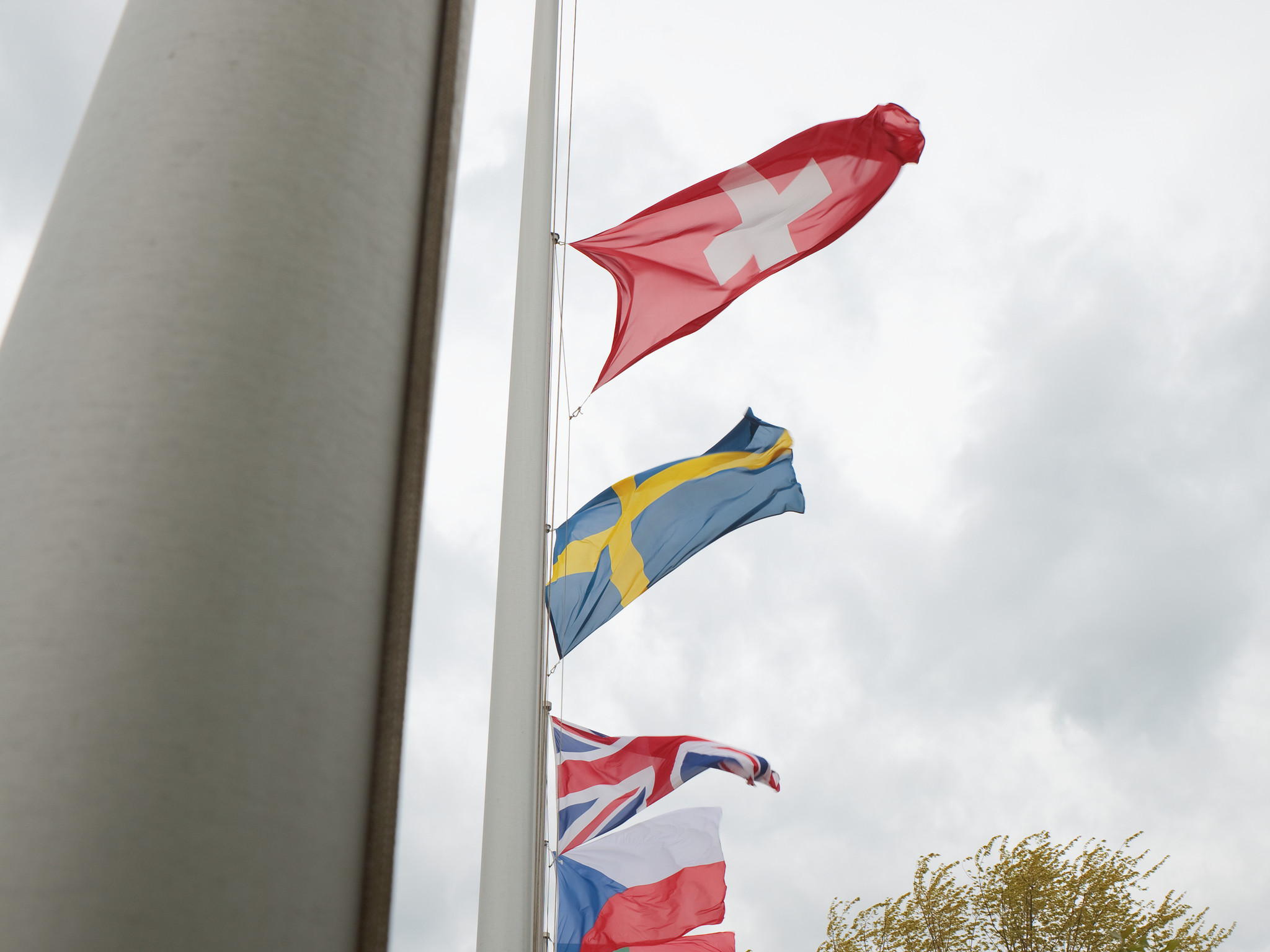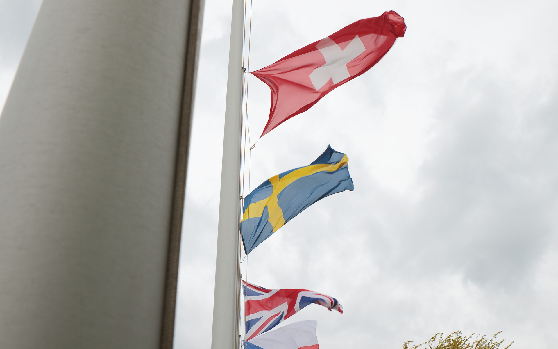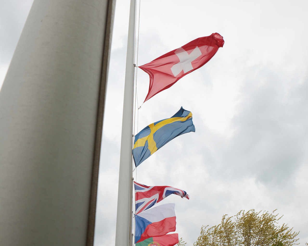 The flags of the ESO member states, at the entrance to the ESO Headquarters in Garching, near Munich (Germany). This image was obtained in March 2009.