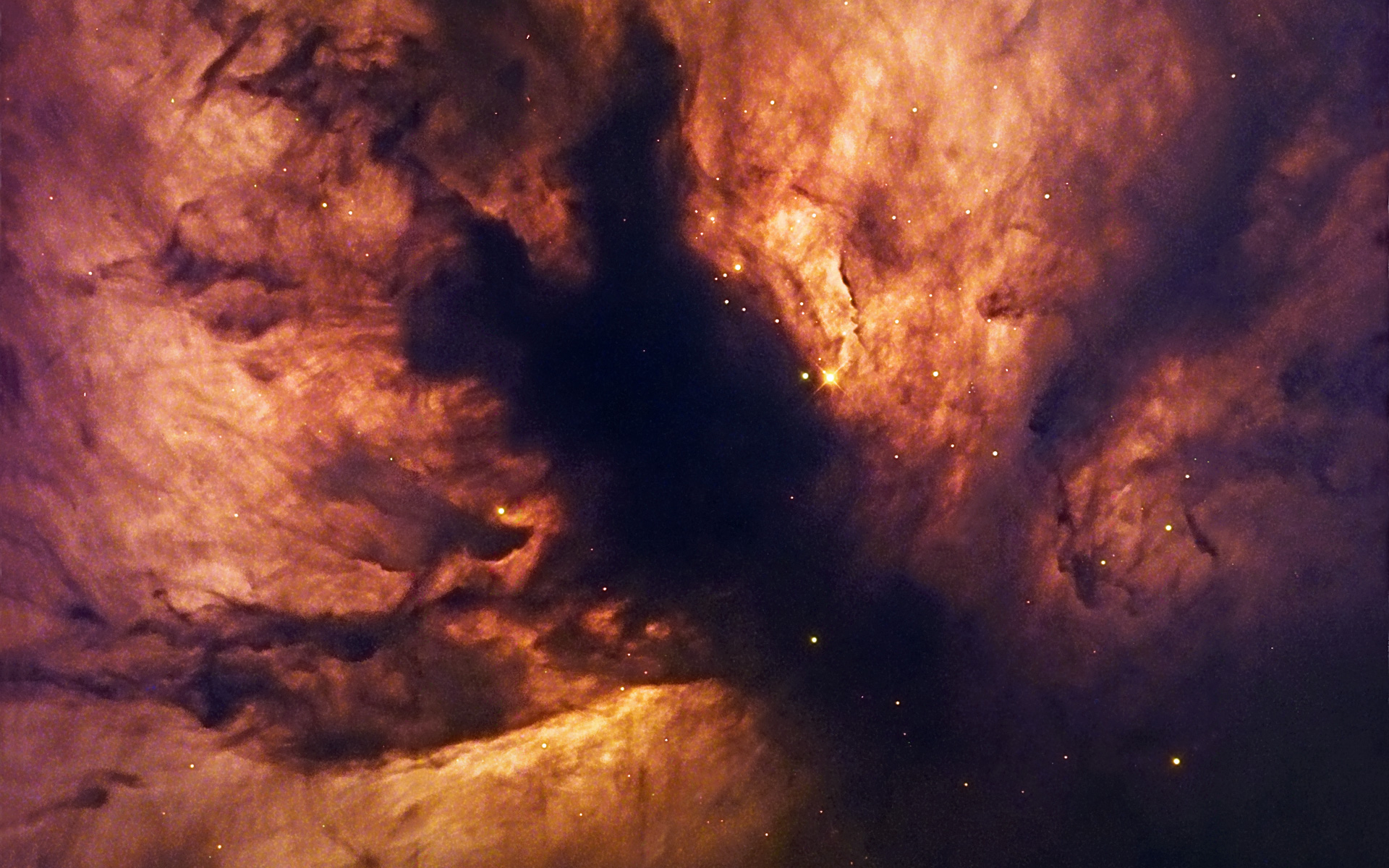 Sparkling at the edge of a giant cloud of gas and dust, the Flame Nebula, also referred to as NGC 2024, is in fact the hideout of a cluster of young, blue, massive stars, whose light sets the gas ablaze. Located 1,300 light-years away towards the constellation of Orion, the nebula owes its typical colour to the glow of hydrogen atoms, heated by the stars. The latter are obscured by a dark, forked dusty structure in the centre of the image and are only revealed by infrared observations.