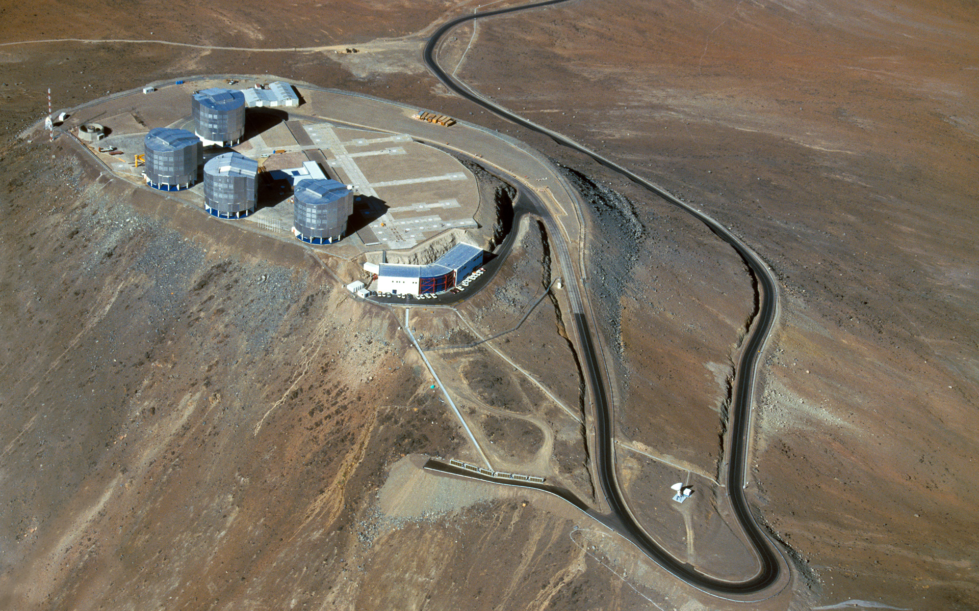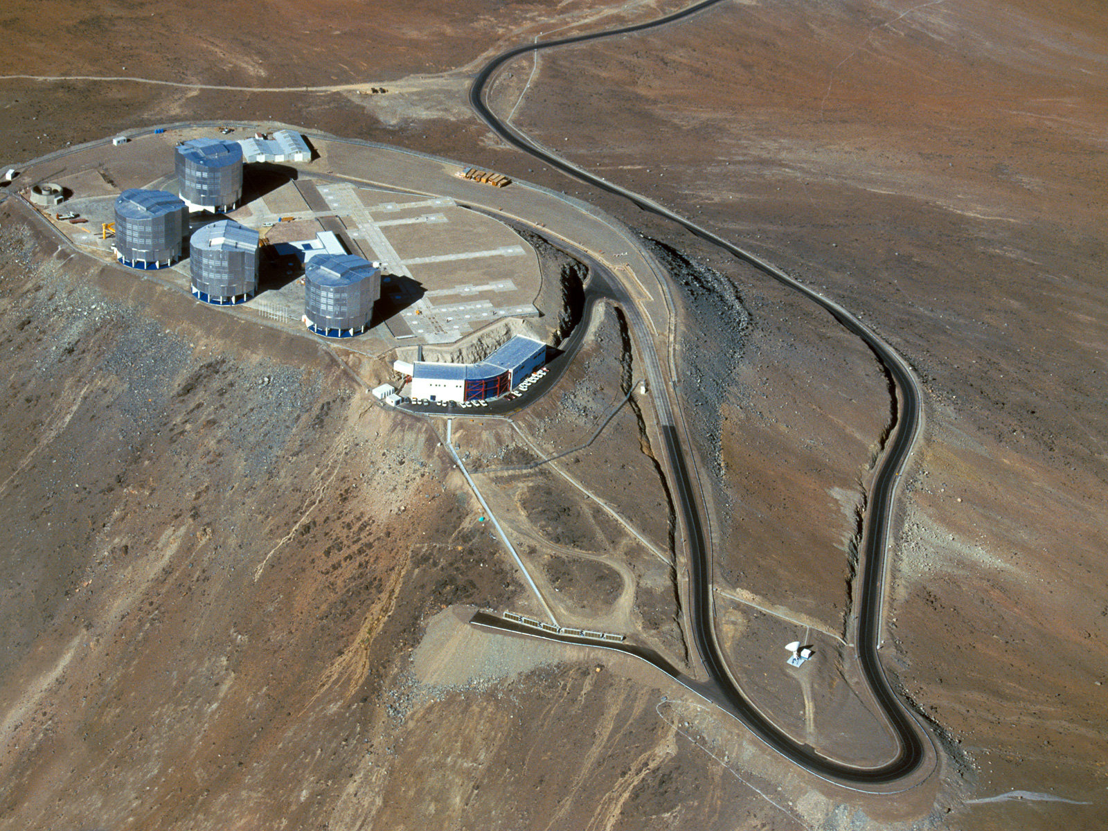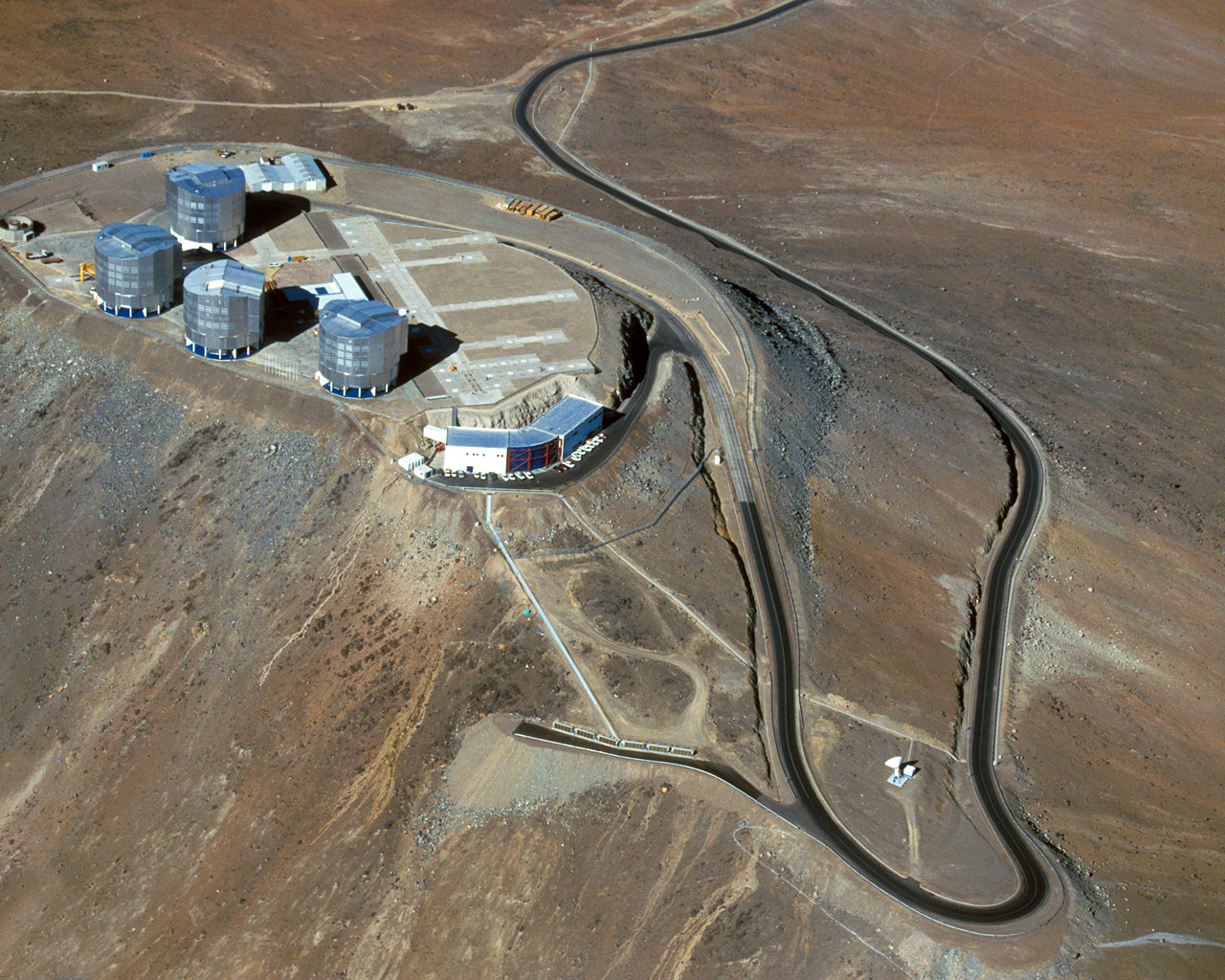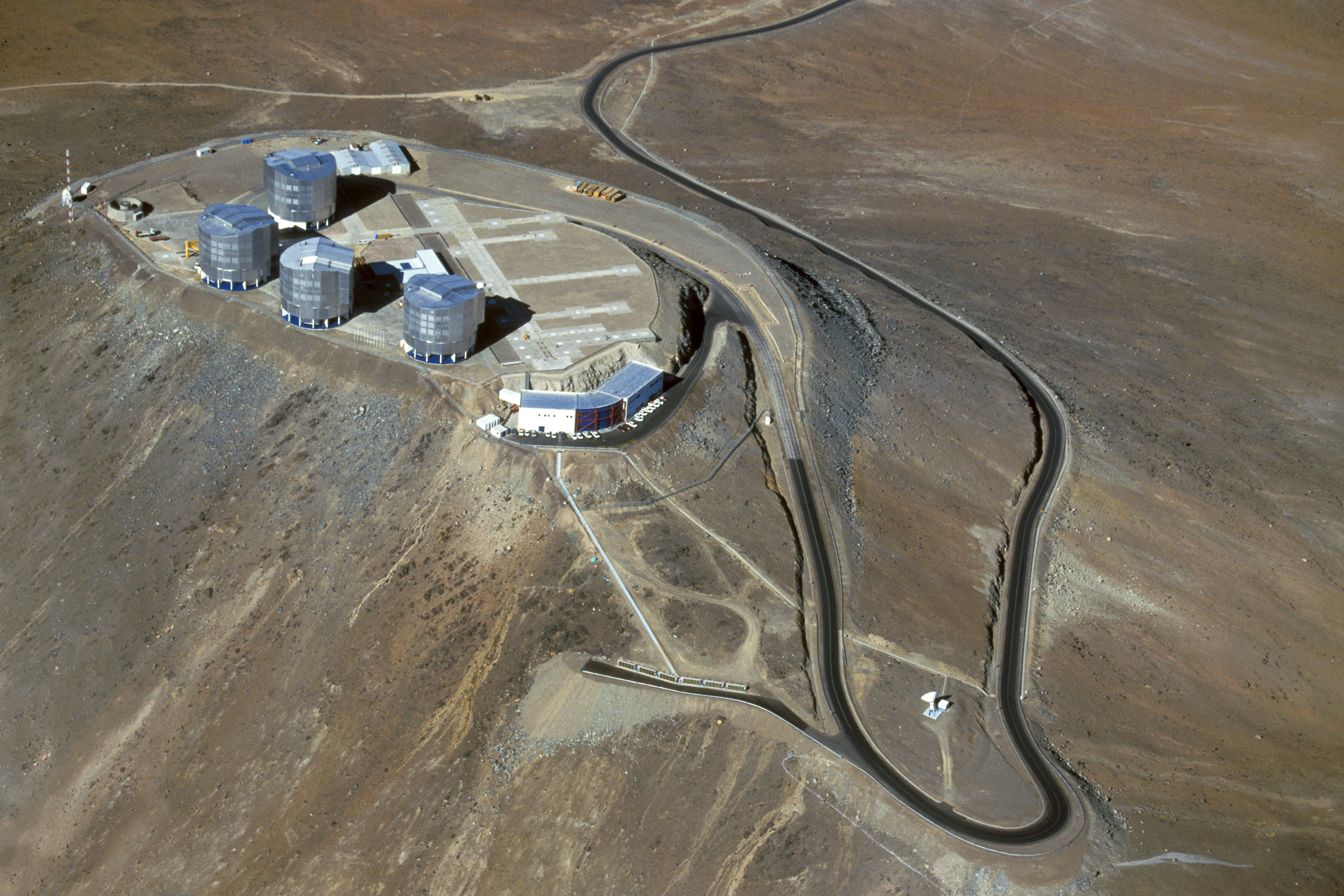 This aerial photograph shows the summit of Cerro Paranal in northern Chile, the home of ESO’s Very Large Telescope (VLT). This flagship facility for ground-based astronomy hosts four 8.2-metre Unit Telescopes along with four mobile 1.8-metre Auxiliary Telescopes. These can work together, in groups of two or three, as one giant telescope, known as the VLT Interferometer, or VLTI.