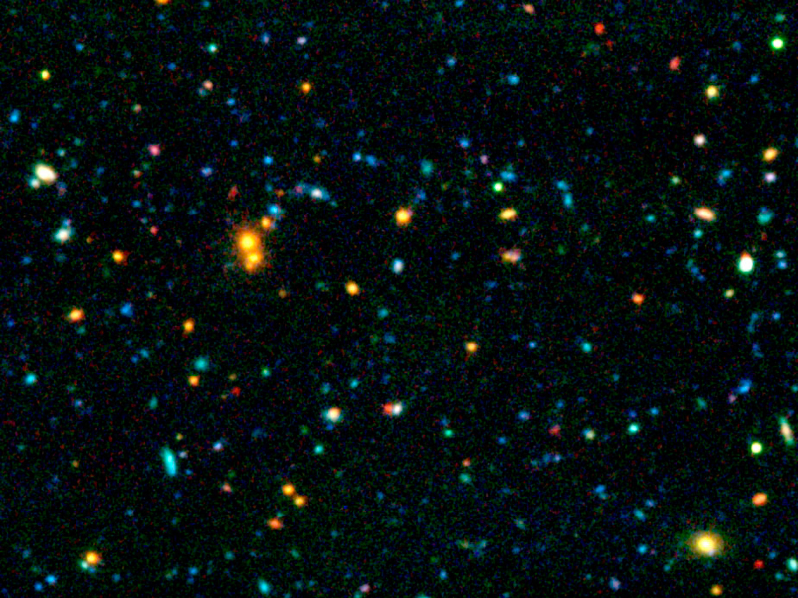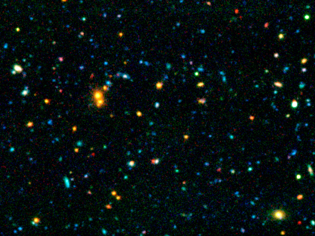This image is a combination of a K-band image from ANTU/ISAAC with two images obtained in the B and R bands with the SUSI-2 optical imager at the New Technology Telescope (NTT) on La Silla. Note the relatively high density of red galaxies, visible in the upper right part of this image. The colours of most of these galaxies are consistent with those of "evolved" galaxies, already present when the Universe was only 4 billions years old.