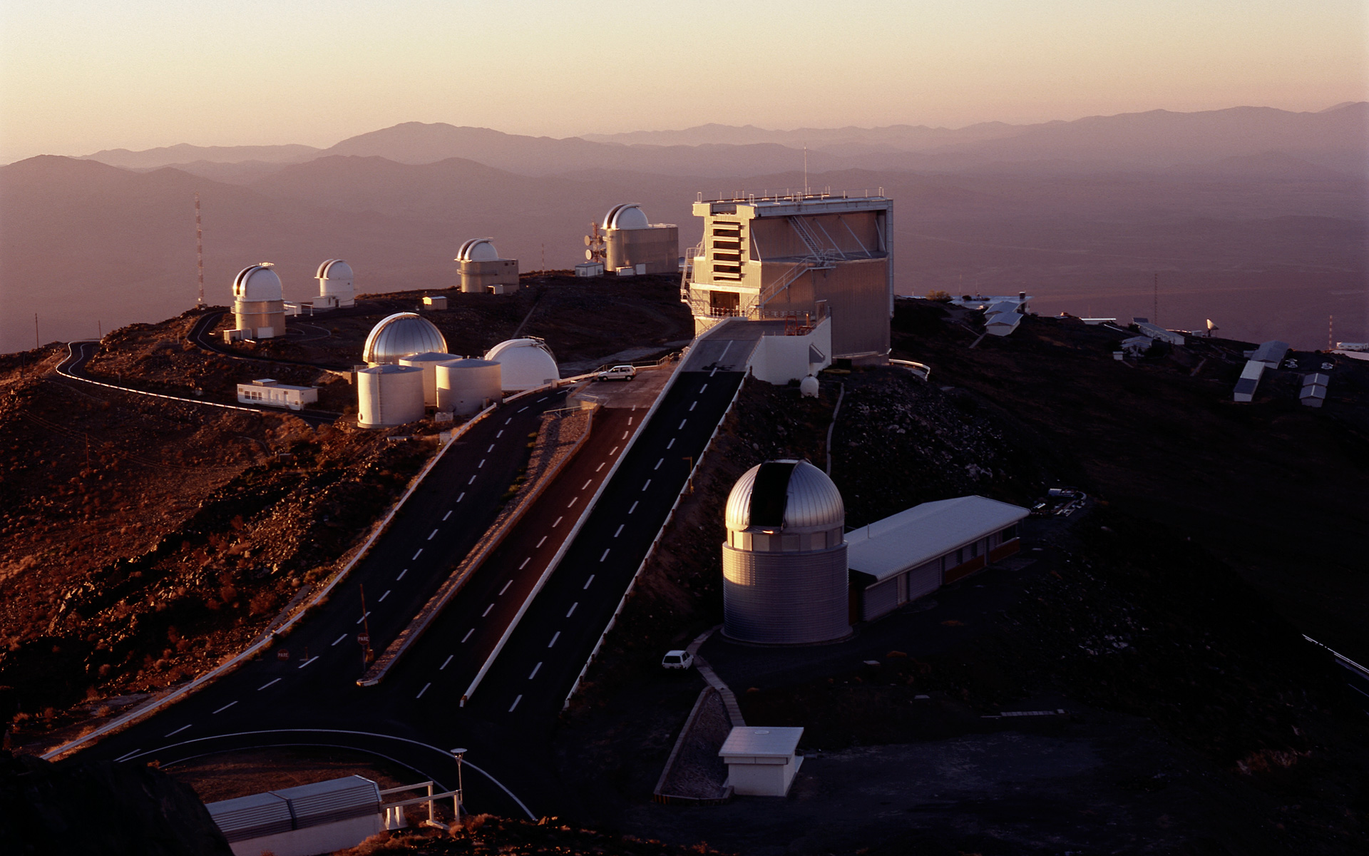 Evening view of La Silla at the moment of "telescope start-up". The dome of the Swiss 1.2-m Leonhard Euler Telescope and the adjacent building are seen in the foreground, immediately to the right of the ramp leading to the ESO 3.6-m New Technology Telescope (NTT) in its octogonal enclosure.