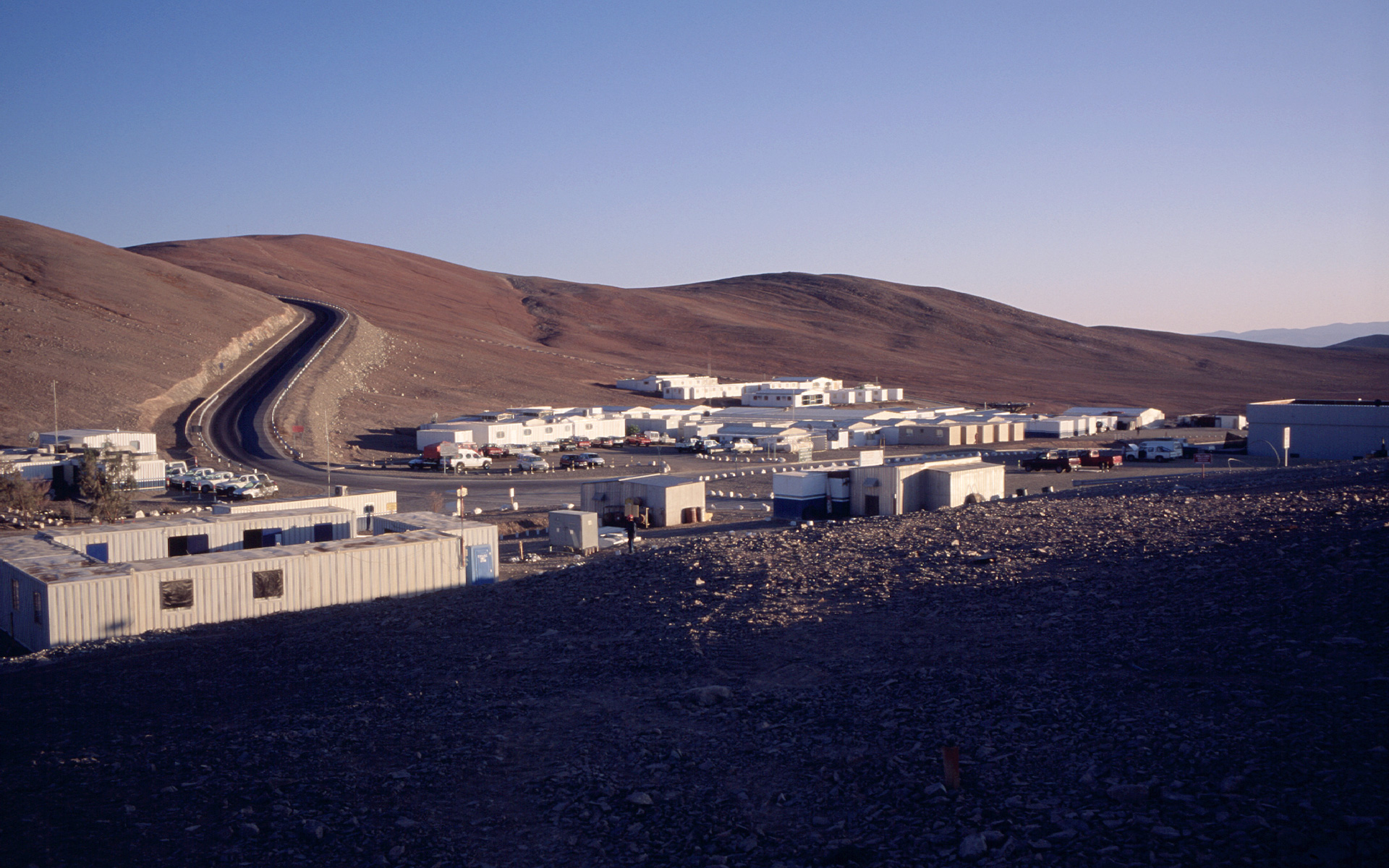 The Paranal Basecamp in morning light, with the first section of the access road to the telescope platform on the top of the mountain in the background. (Photo obtained on March 16, 2000)