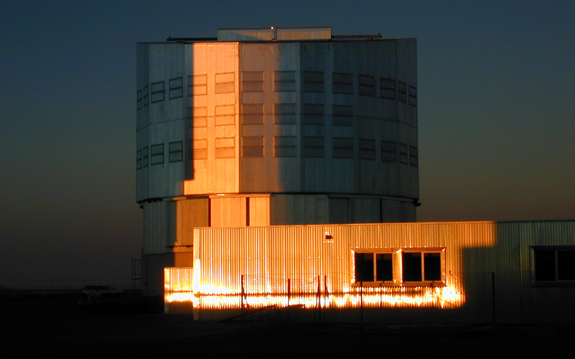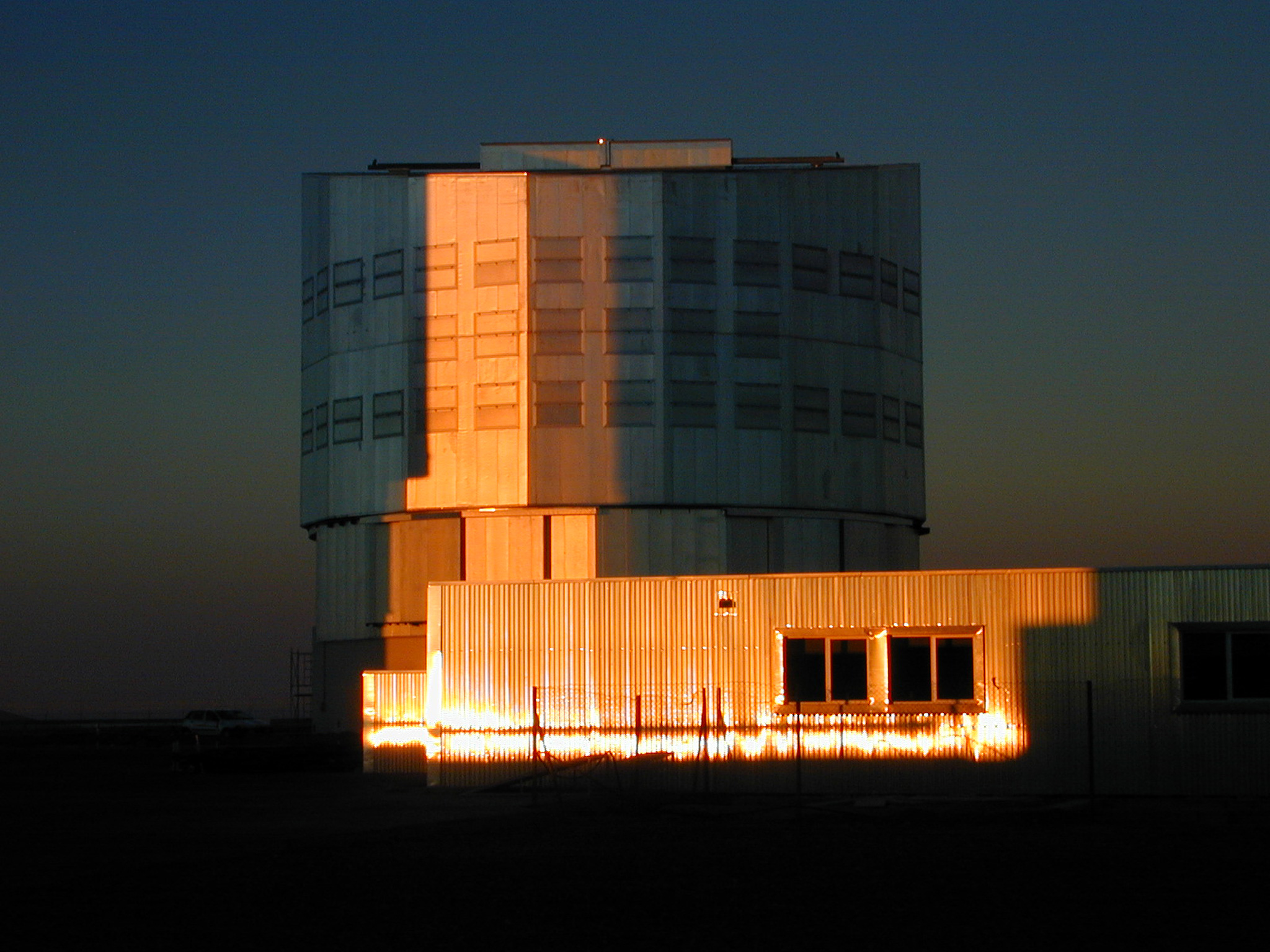 The enclosure for the fourth VLT 8.2-m Unit Telescope, YEPUN, photographed at sunset on September 3, 2000, immediately before "First Light" was successfully achieved. The upper part of the mostly subterranean Interferometric Laboratory for the VLTI is seen in front.
