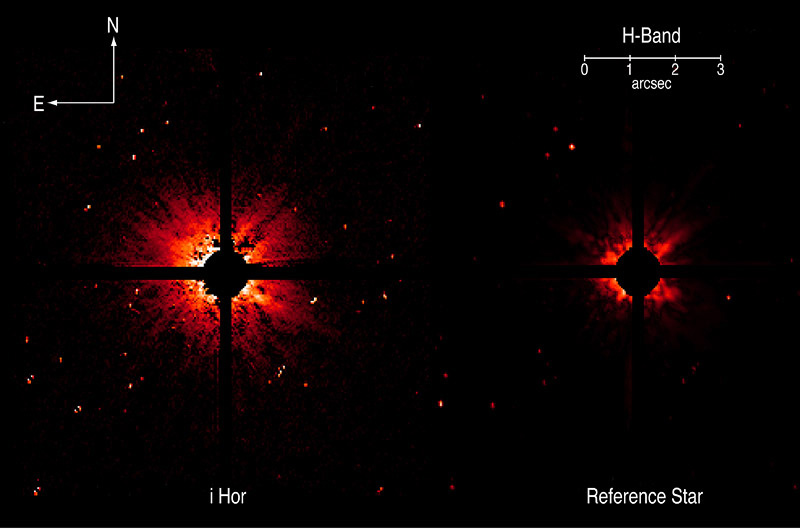 Technical information: The intensity scale ranges from 0.1 (deep red) to 100 (white) mJy/arcsec 2 (surface brightness). The diameter of the mask is 1.0 arcsec, corresponding to 17 AU (2550 million km) at the distance of iota Horologii (56 light-years). The images are based on 150 integrations of 4 seconds each, i.e. a total exposure time of 10 min. The observing conditions were excellent (0.6 arcsec seeing) and the achieved image resolution by the adaptive optics system (approx. 0.11 arcsec) is near the best possible (the "diffraction limit") at this wavelength (H-band at 1.64 µm).