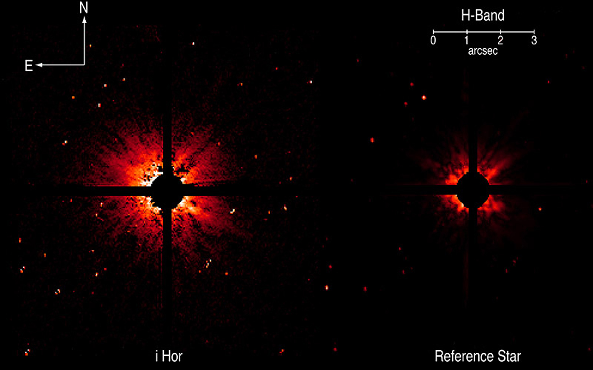 This image displays a dusty disk around the star iota Horologii (left) as compared with that of a "reference" star (right). At a distance of 56 light-years from Earth, Iota Horologii was already known to possess an extrasolar planet. The discovery of the disk may help to better understand how this exoplanetary system was formed. The observations were obtained with the ADONIS adaptive optics instrument at the ESO 3.6-m telescope on La Silla. The strong stellar light in the central area of the two images has been blocked with an instrumental mask. While the image processing still leaves some unavoidable stray light around the reference star (mostly due to reflections within the instrument), a much brighter, diffuse disk around iota Horologii is clearly visible.