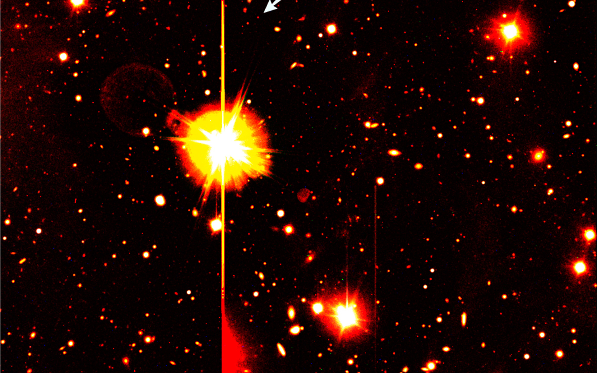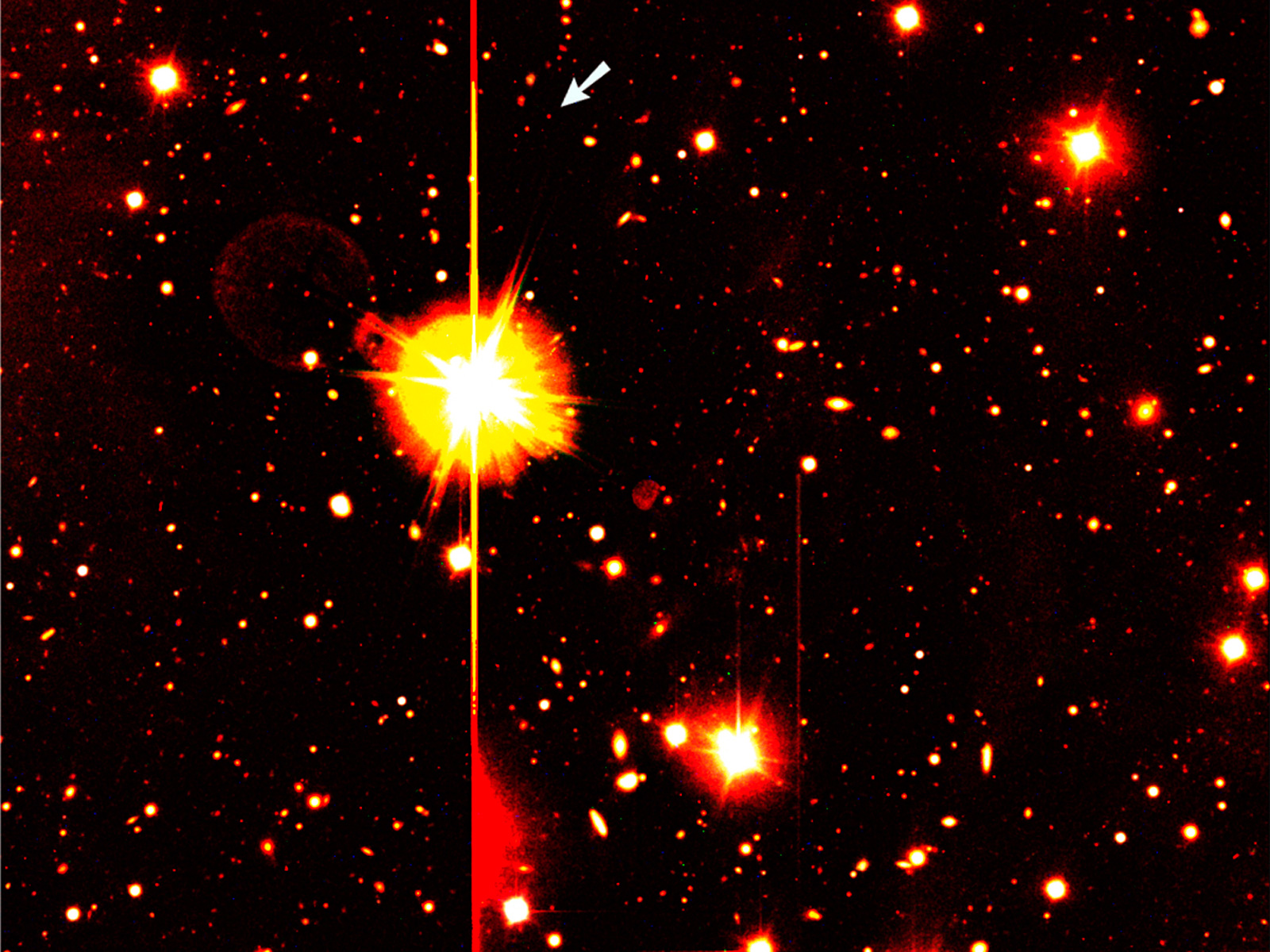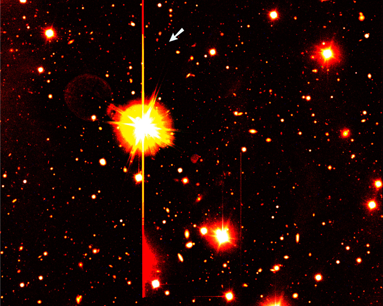 Colour composite image of the sky field around the position of the gamma-ray burst GRB 000131 that was detected on January 31, 2000. It is based on images obtained with the ESO Very Large Telescope at Paranal. The object is indicated with an arrow, near a rather bright star (magnitude 9, i.e., over 1 million times brighter than the faintest objects visible on this photo). This and other bright objects in the field are responsible for various unavoidable imaging effects, caused by optical reflections (ring-shaped "ghost images", e.g. to the left of the brightest star) and detector saturation effects (horizontal and vertical straight lines and coloured "coronae" at the bright objects, and areas of "bleeding", e.g. below the bright star).