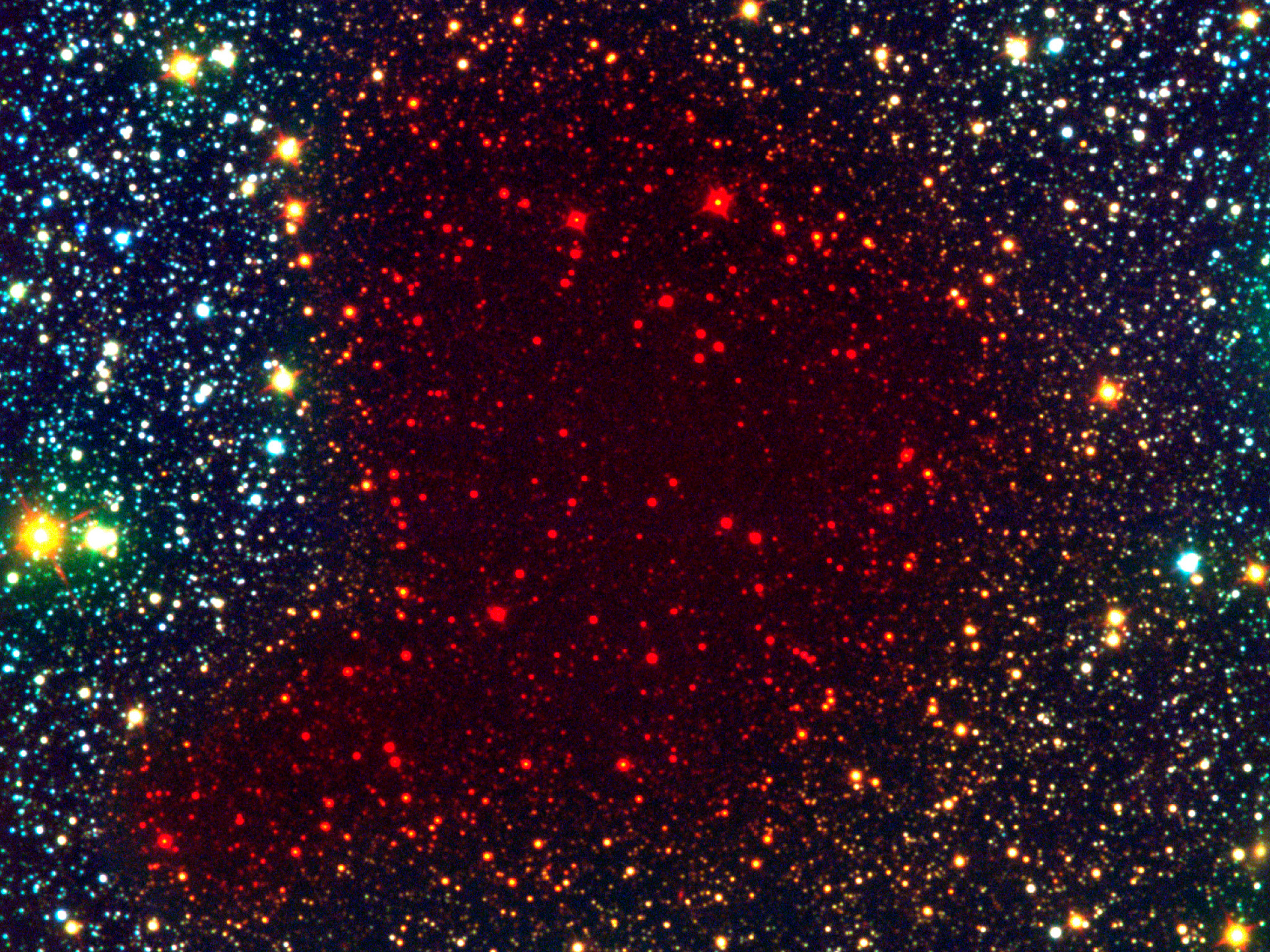 This view of the dark cloud B68, a so-called Bok globule, is a false-colour composite based on a visible (here rendered as blue), a near-infrared (green) and an infrared (red) image. Since the light from stars behind the cloud is only visible at the longest (infrared) wavelengths, they appear red.