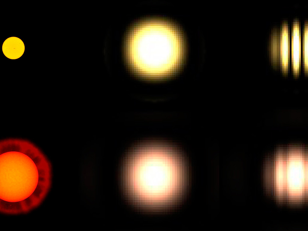 Demonstrates in a schematic way, how the images of two stars of different angular size (left) will look like, with a single telescope (middle) and with an interferometer like the VLTI (right). Whereas there is little difference with one telescope, the fringe patterns at the interferometer are quite different. Conversely, the appearance of this pattern provides a measure of the star's angular diameter.