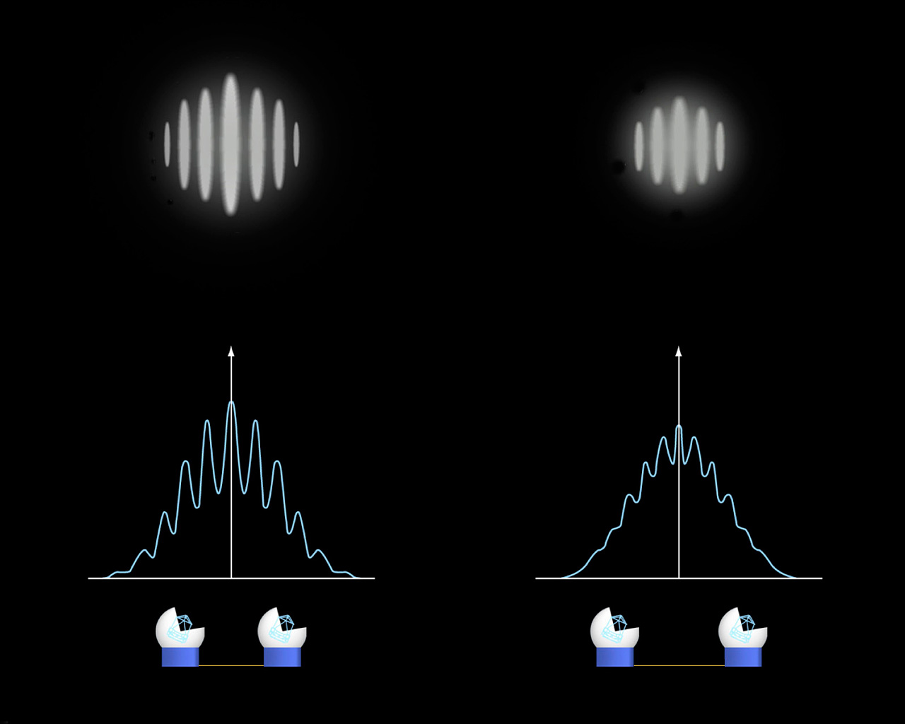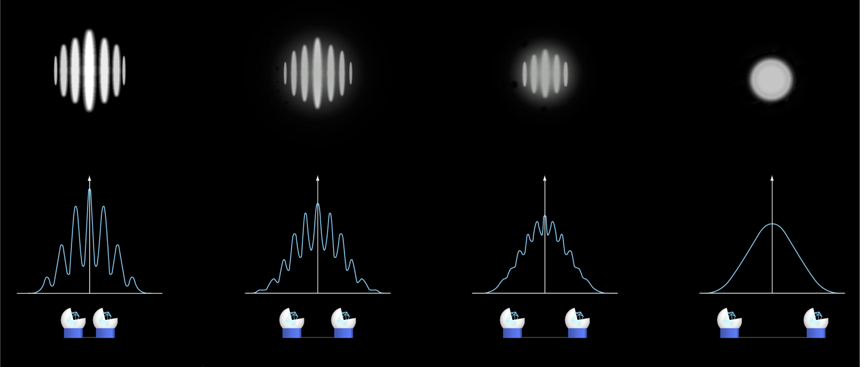 Interferometric observations of a single star are shown, as the distance between the two telescopes is gradually increased. The observed pattern at the focal plane clearly changes, and the "fringes" disappear completely. See the text for more details.
