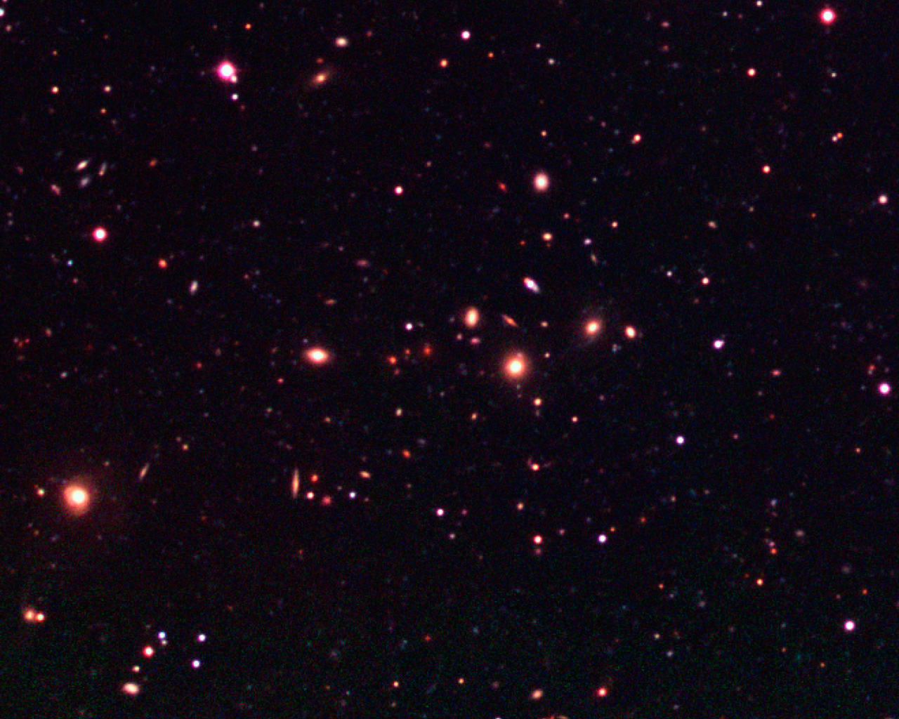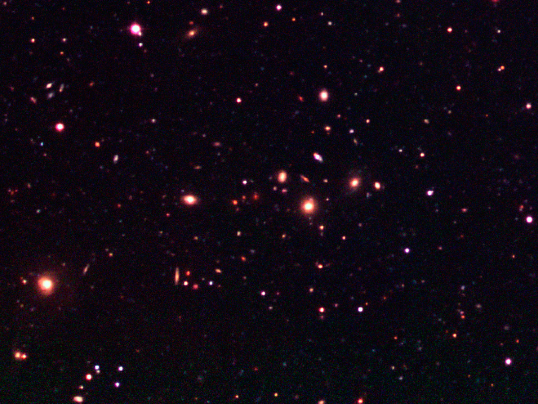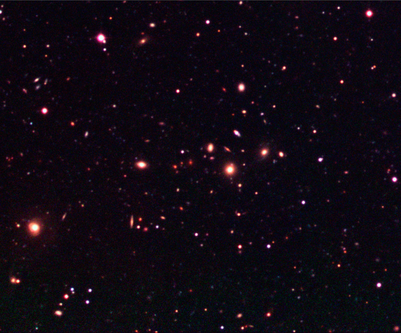 This image shows an enlargement of a moderately distant galaxy cluster in the south-east quadrant (lower left) of the Capodimonte Deep Field. The field measures 1380 x 1260 pixels, or about 5.5 x 5.0 arcmin 2 in the sky.